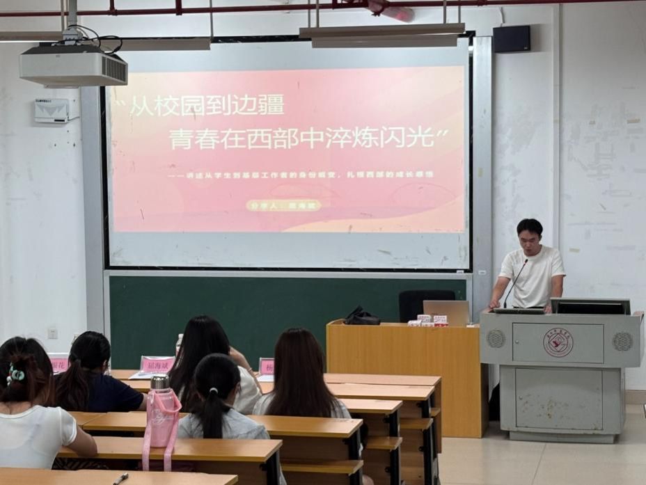 屈海斌以“从校园到边疆,青春在西部中淬炼闪光——讲述从学生到基层工作者的身份改变,扎根西部的成长感悟”为主题,向学生讲述了他参与西部计划的难忘经历,以扎根西部的奋斗故事,激励青年学子投身基层,让青春在祖国最需要的地方绽放光彩。