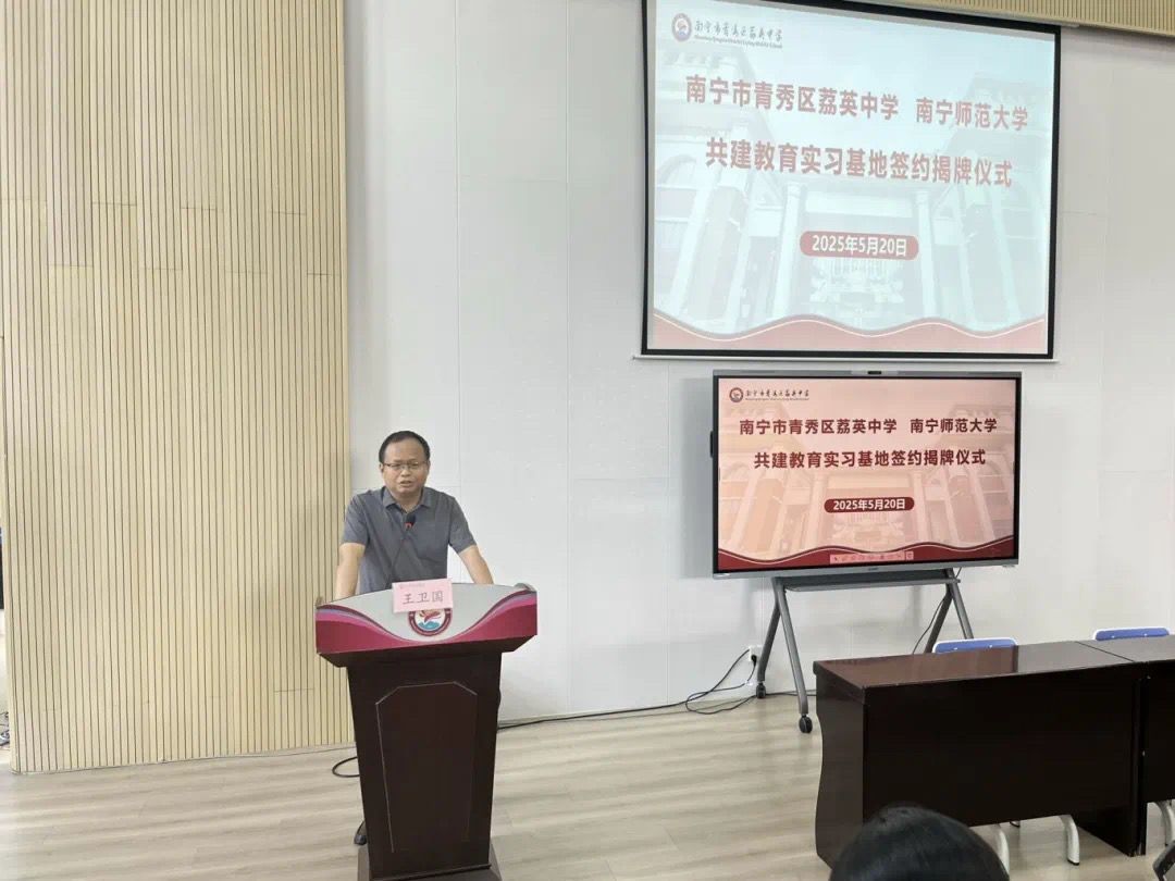 王卫国对南宁市青秀区荔英中学为马克思主义学院实习生提供教育实习平台表示衷心的感谢,详细介绍马克思主义学院的专业建设、人才培养、教学科研成果等基本情况,希望以建立教育实习基地为契机,建立长期稳定的合作关系,让教育向更深层次、更高水平迈进,实现双方合作共赢。