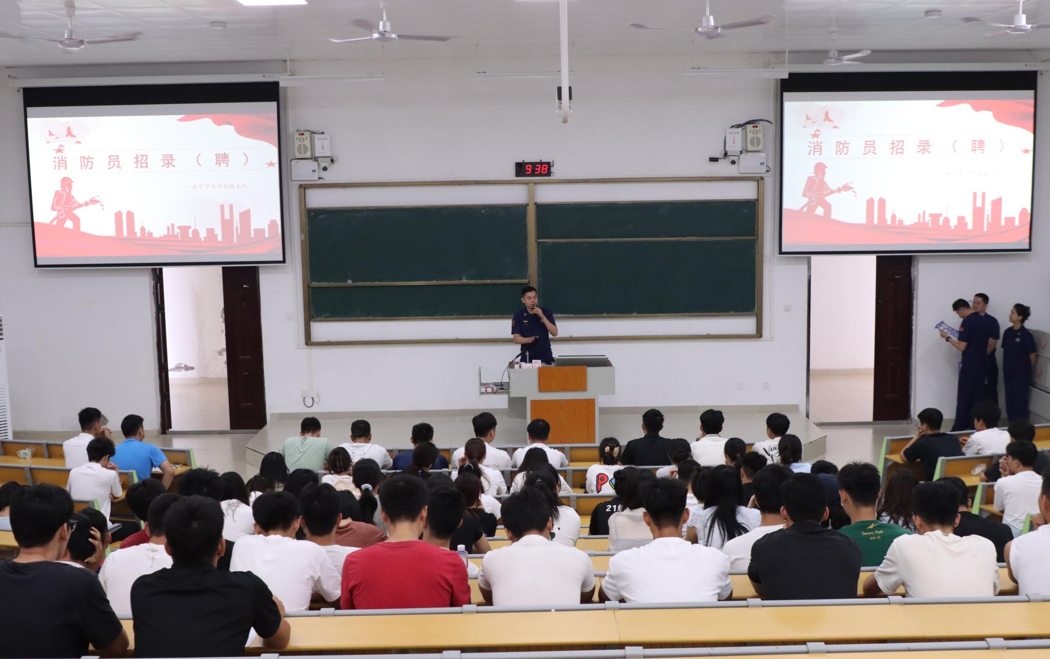 为进一步落实2025届毕业生就业工作,5月23日,体育与健康学院邀请南宁市消防救援支队入校开展促就业座谈会及招聘宣讲会。会议分别在武鸣校区3号实验楼1517会议室、2号实验楼B108教室举行,学院党委书记磨有积、副书记陈军弟及学工办老师出席,超80名毕业班学生参加招聘宣讲会。