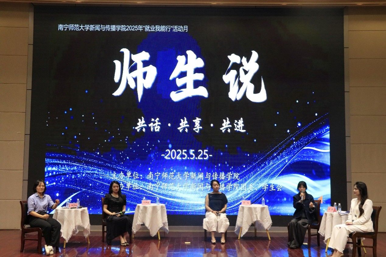 5月25日晚,新闻与传播学院在文综114报告厅举办“就业我能行”活动月之“师生说”访谈会。学院党委副书记黄敏、院长助理宋丽丽、团委书记李樱花、学工办辅导员兰浩玮以及2011届新闻学专业佟镝、2021届播音与主持艺术专业张灵智、2022届广告学专业麦昕三位毕业生代表到场参加。