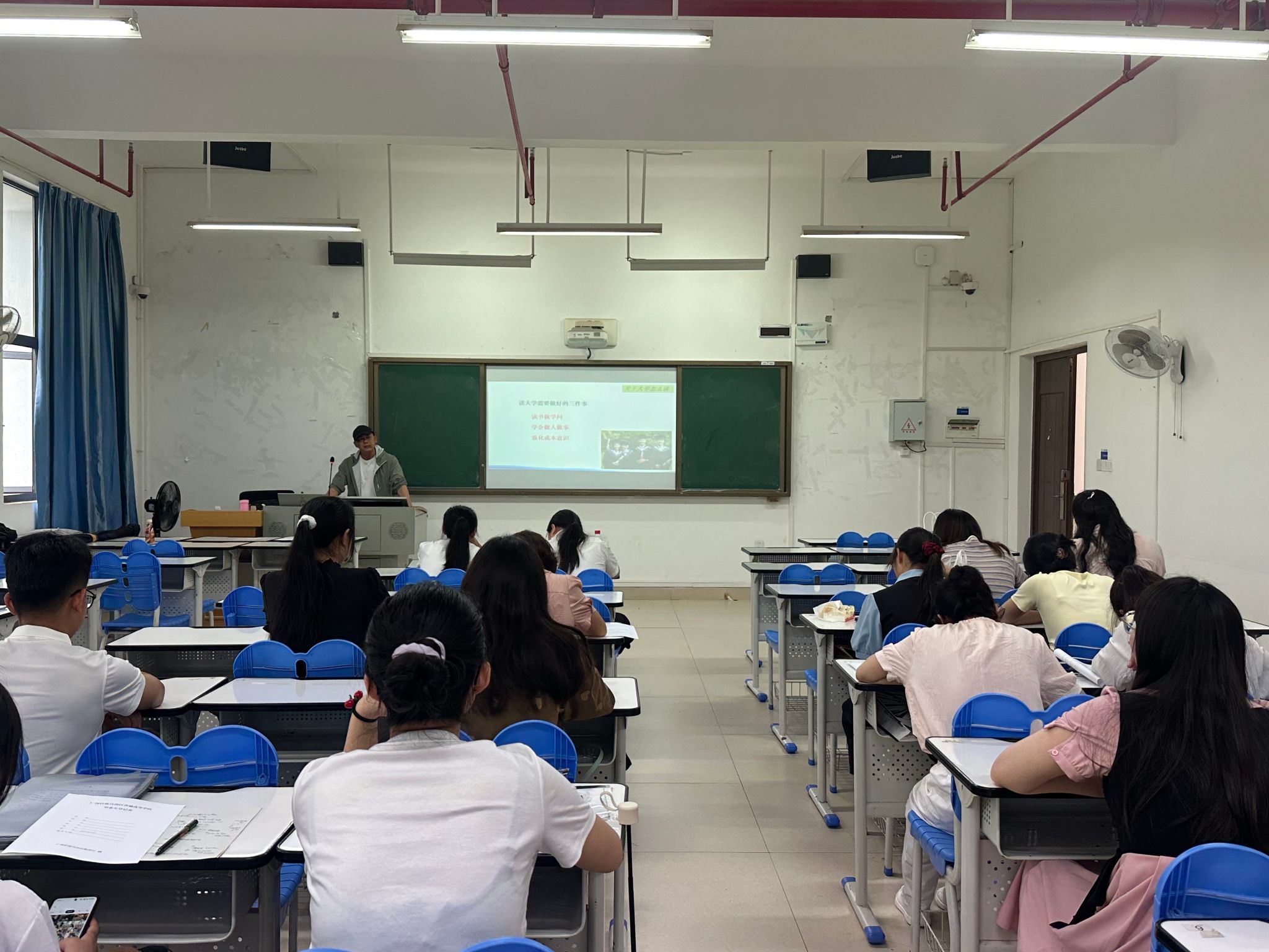 讲座内容分为两大核心板块,紧扣行业实际与学生需求。在“洞察行业,明晰职责”板块,秦老师系统地介绍了教培机构托辅岗位的工作职责,涵盖作业辅导、托管及素质课教学等关键内容,并详细解析了当前教培企业对人才的岗位需求与能力画像,为毕业生锚定职业方向提供了清晰指引。在“策略赋能,高效求职”板块,秦老师围绕“思考问题——给出建议——设计方案——完成积累——实现目标”的递进式求职指导框架,引导在座毕业生深入思考大学分类、求学规划、自我认知、应聘技巧和社交礼仪等问题,并提出独创的“3568解决方案”——即“三个规矩”、“五大要领”、“六个目标”和“八项注重”,为毕业生规划高效求职路径提供了系统性指导支撑。