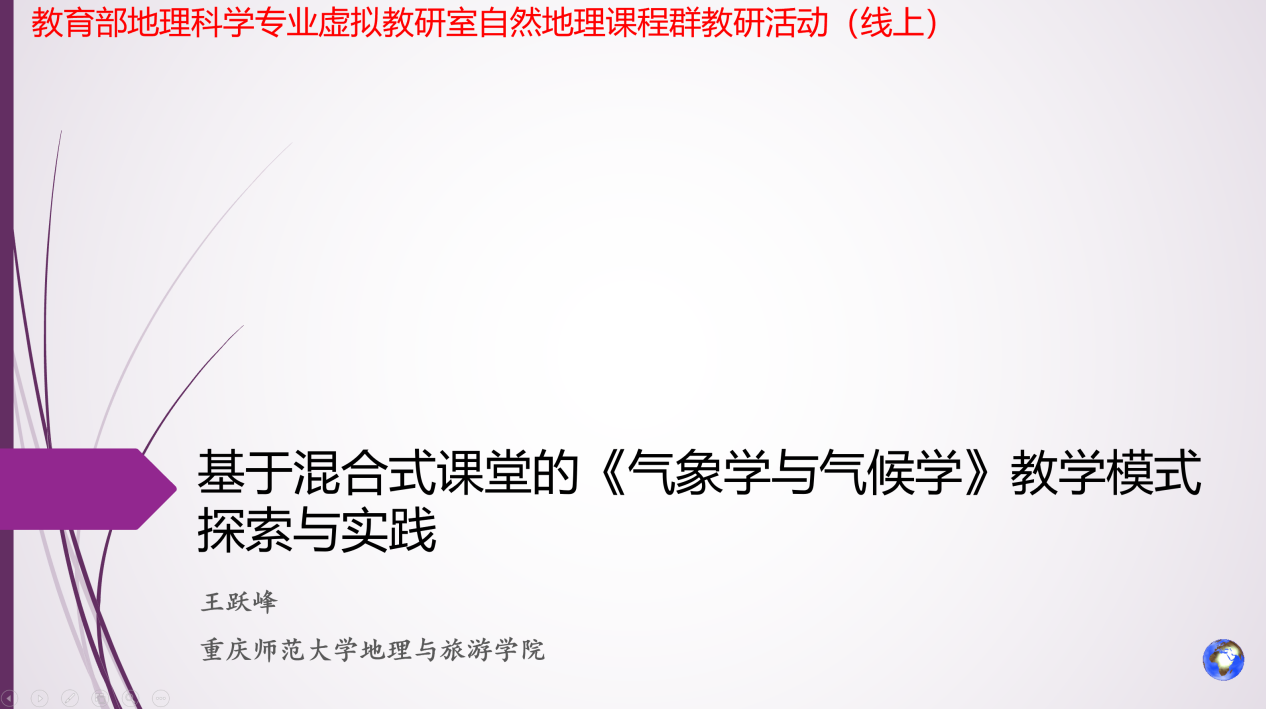 重庆师范大学王跃峰副教授以“基于混合式课堂的《气象学与气候学》教学模式探索与实践”为主题,介绍了重庆师范大学自然地理学课程体系设置概况,以《气象学与气候学》课程为例介绍了该课程线上线下混合教学的经验。该课程通过气象热点问题、天气预报、气象气候思政、高中气象气候知识、高考气象气候试题等,丰富了课程资源,实现了和基础教育需求的对接。