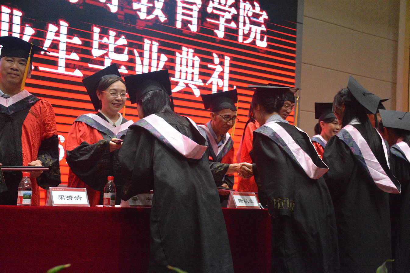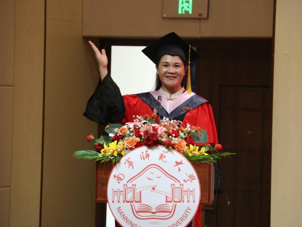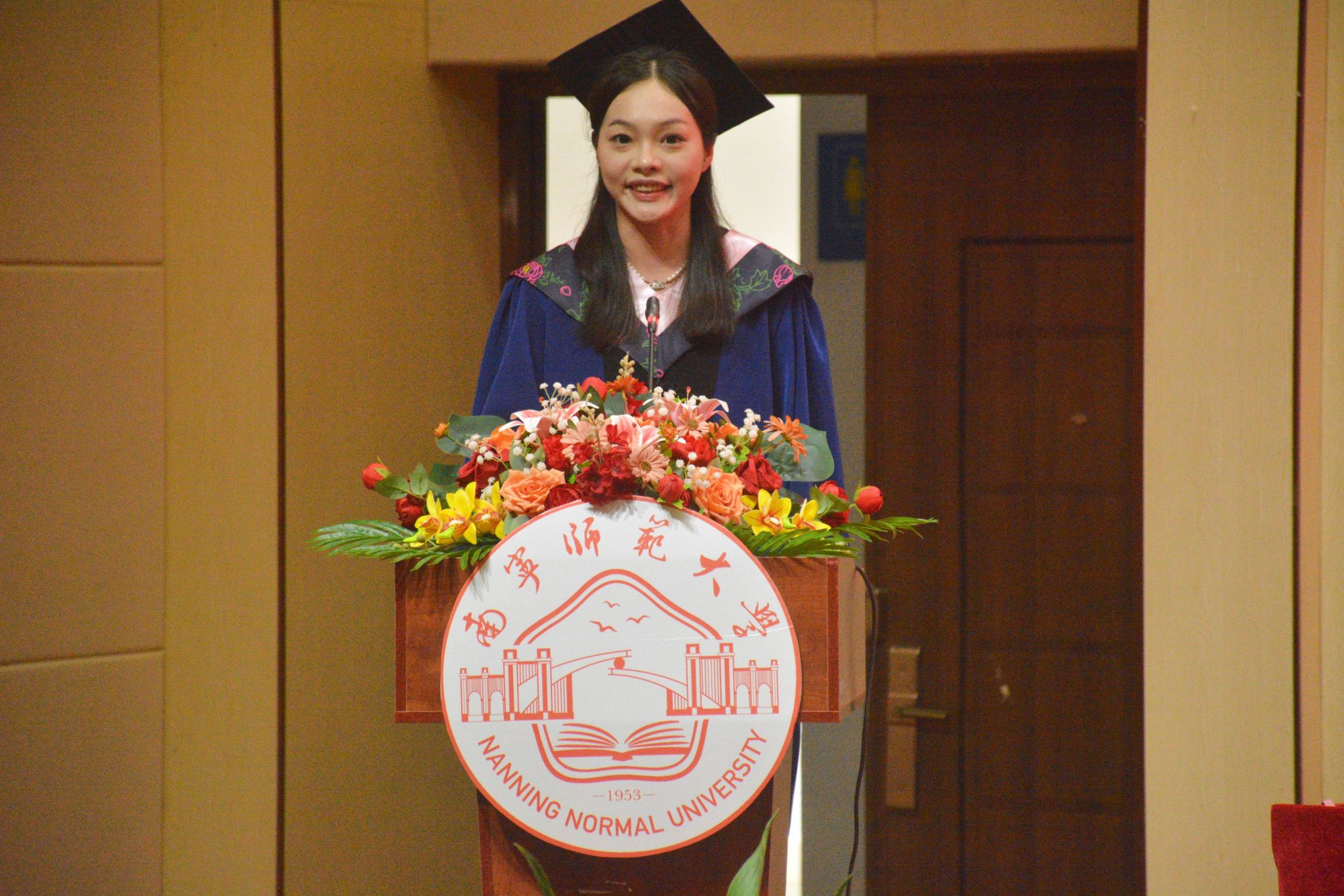 接着,校友代表、教师代表、毕业研究生代表和毕业本专科生代表分别发言。其中,校友代表、南宁市五象新区第一实验小学政教处副主任、全国优秀少先队大队辅导员陈媚以“从讲台到讲台”的职业经历分享感悟,勉励学弟学妹们以专业素养与教育情怀照亮教育的浩瀚星空。
