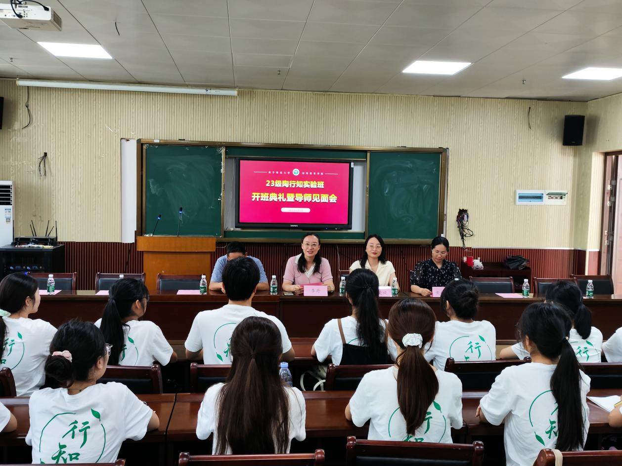 6月3日下午,初等教育学院在五合校区理综楼803举行2023级陶行知实验班开班典礼暨导师见面会。初等教育学院院长梁宇、副院长梁秀清,小教系主任林国兵,陶行知实验班负责人李丹,导师李美旋、罗聿言、李健、黄姣华以及2023级陶行知实验班全体同学参加。活动由李丹老师主持。
