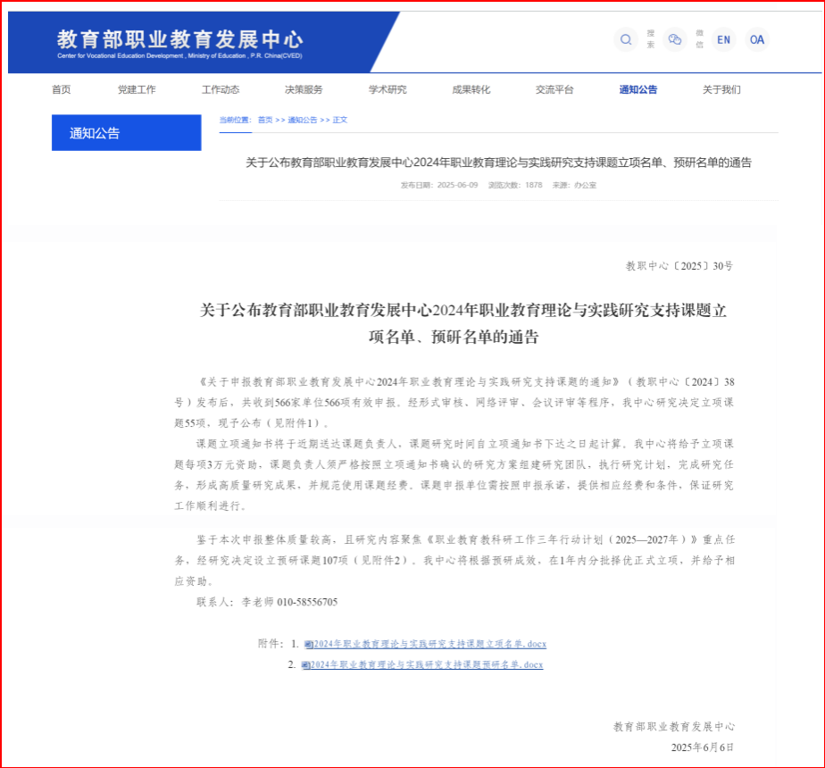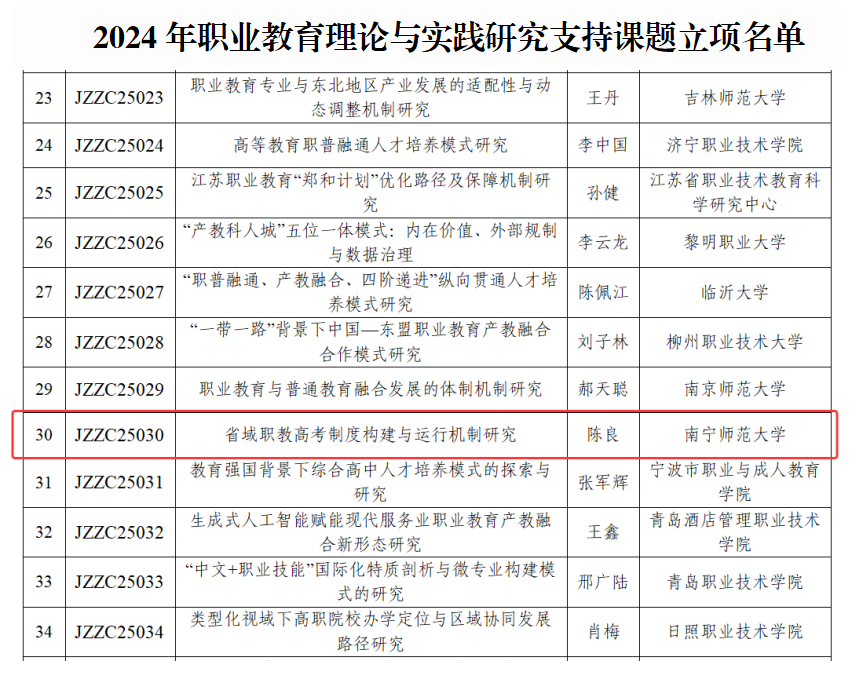 近日,教育部职业教育发展中心公布2024年职业教育理论与实践研究支持课题立项名单,开元官网职业技术师范学院院长陈良教授主持申报的《省域职教高考制度构建与运行机制研究》课题成功获批立项。该课题聚焦在现代职业教育体系构建中的热点问题,省域职教高考制度如何突破传统框架,构建起具有前瞻性、创新性的制度框架,以及形成与之适配的良性运行机制,旨在为新时代职业教育改革提供理论支撑与实践路径,标志着开元官网在职业教育研究领域取得新突破。