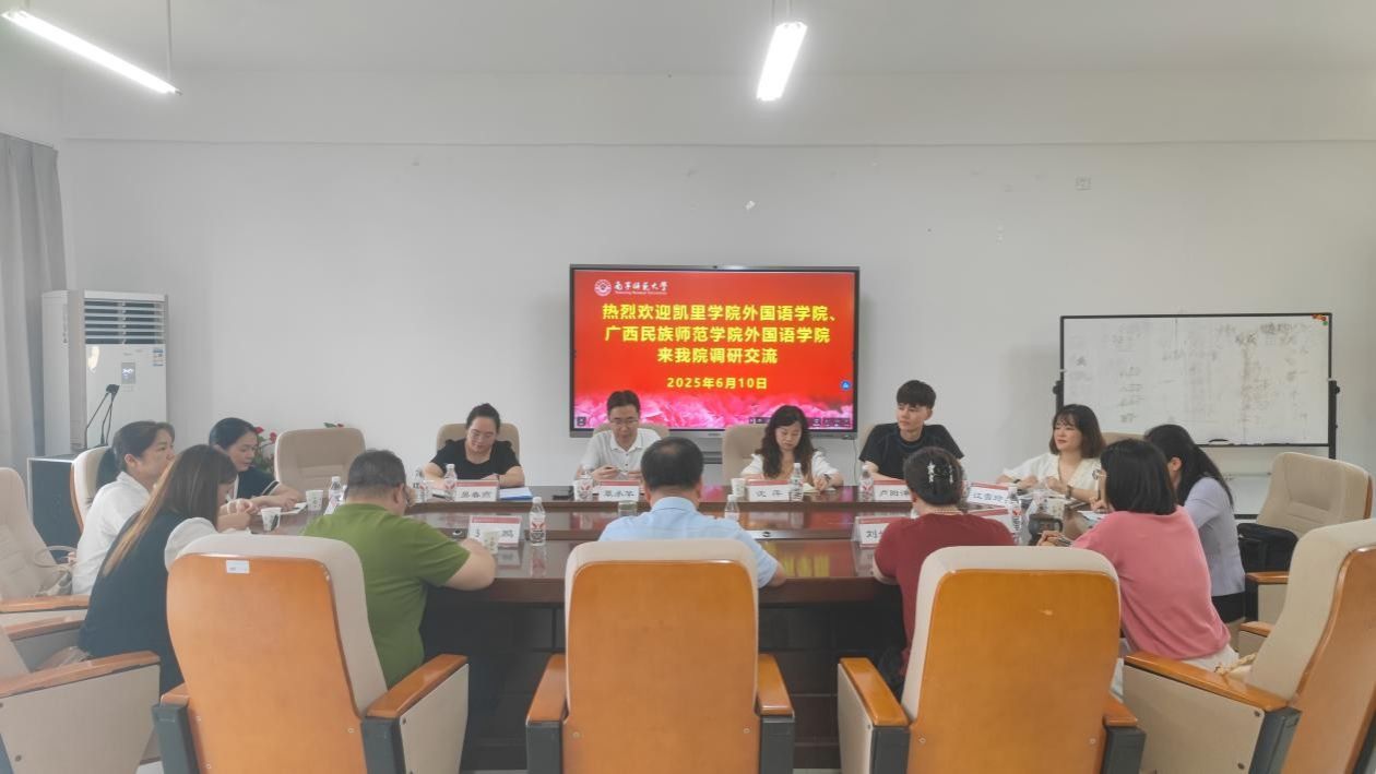 2025年6月10日下午,广西民族师范学院外国语学院覃承华院长、凯里学院外国语学院沈萍副院长(主持工作)联合率队一行9人到开元官网外国语学院调研交流,外国语学院院长陈光伟、副院长张晓鹏、英语系主任刘婷婷、翻译教研室主任樊毅出席座谈会。