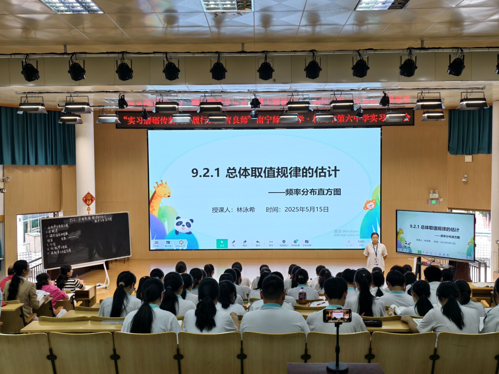 5月15日下午,在实习生与教学指导老师的共同努力下,实习生林泳希以“样本估计总体”的公开课作为中期检查的报告成果,学院黄在堂院长、杨立英教授、陈蔚凝老师莅临指导,给予了肯定和鼓励的同时,希望实习生们接下来的工作中继续积极配合学校工作、注意教学细节、锻炼个人能力,并感谢柳州市第六中学对实习生的栽培。
