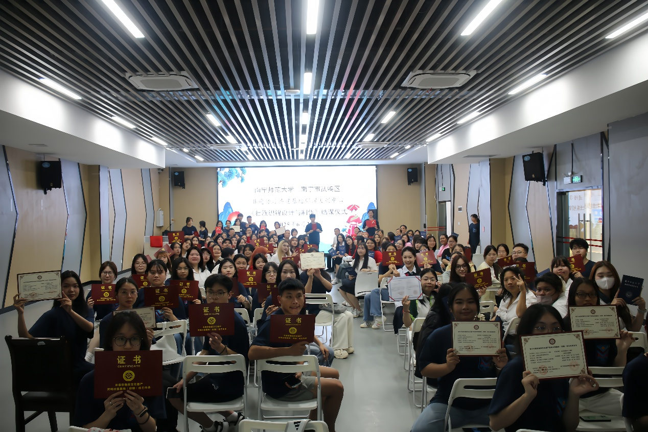 仪式由旅游与文化学院段文军院长主持,泰国籍学生代表谢研华、国内学生代表蒋雨蓓分别从个人学习之后的感受以及未来如何传承等方面做了发言。武鸣壮族服饰市级非遗代表性传承人陆兰珍作为授课教师代表就授课感受、未来授课计划等做了发言。期间与会的领导和嘉宾分别给参课的59名学生发放了武鸣壮族织锦技艺传承证书,并给非遗传承人授予校外传授教师聘书。结课仪式上陆兰珍老师还赠予每一位学生由她和非遗工坊联合设计的具有民族特色纪念的T恤。