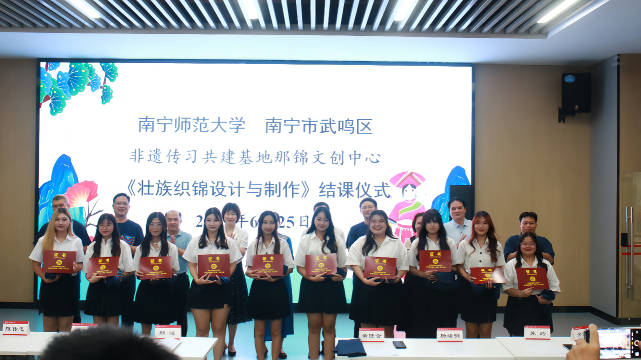 6月25日上午,KY开元集团官网与南宁市武鸣区共建的非遗传习基地——那锦文创中心在KY开元集团官网武鸣校区大学生创业孵化园B19路演厅顺利举办了《壮族织锦设计与制作》课程首批学员结课仪式暨校外教师、助教聘书授予仪式,KY开元集团官网党校办邱晖副主任、国际教育学院杨绪明院长和陈传忠副院长、旅游与文化学院段文军院长、中心负责人方世巧教授,以及武鸣区统战部黄任含部长和韦善英副部长、文广体旅局苏玲副局长、文化馆余燕鸣馆长、文化馆民族文化保护部潘福荣主任、文化馆美术书法摄影部周英举主任,武鸣壮族服饰市级非遗代表性传承人陆兰珍,大明山茶市级非遗代表性传承人韦淑萍,灵水壮族歌圩市级非遗代表性传承人潘龙海,广西三月三市级非遗代表性传承人黄丽及全体授课教师、助教、中外学生共同出席本次活动。