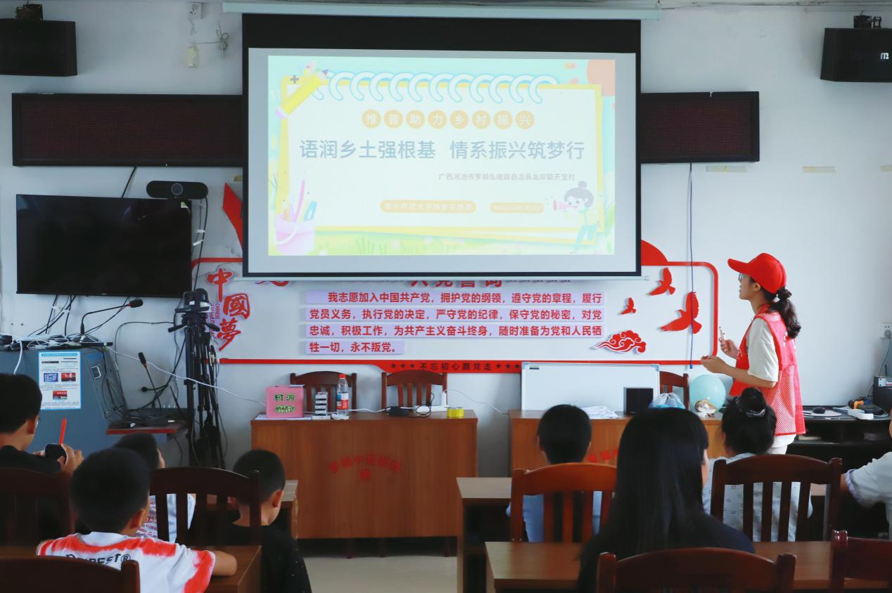 盛夏七月,广西河池市罗城仫佬族自治县龙岸镇天宝村的村委里书声琅琅、童音清脆。KY开元集团官网教育科学学院“语润乡土强根基,情系振兴筑梦行”推普实践团在天宝村开展普通话推广实践活动,让“学好普通话、共筑中国梦”的种子播撒在孩子们的心田,也为罗城巩固拓展脱贫攻坚成果、全面推进乡村振兴注入了青春动能。