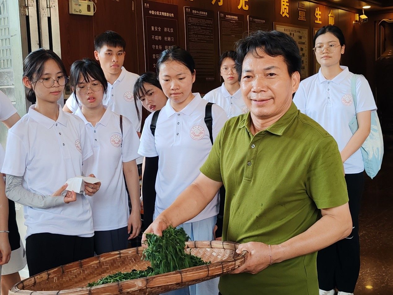 浸润地方文化。7月14日下午,研学团走进广西农垦茂圣茶业有限公司,在非物质文化遗产“六堡茶制作技艺”传承人、公司董事长黄佑红的示范教学中,同学们亲身体验杀青、揉捻等制作工艺,学习冲泡、包茶方法,于茶香中领悟传统文化的独特魅力。随后的龟苓膏制作体验环节,从精准配比到模具成型的细致操作,同学们深刻体会到“药食同源”的文化精髓。