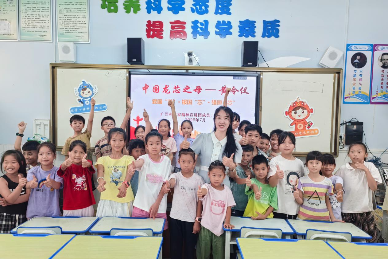 广西科学家精神宣讲团成员李樱花老师为同学们讲述了被誉为“中国龙芯之母”广西科学家黄令仪的人物事迹和科研成就。李樱花老师以“爱国芯、强国芯、报国芯”为主题,聚焦广西本土科学家黄令仪的感人事迹与崇高精神,深情讲述了黄令仪女士将毕生心血倾注于国家芯片研发事业的奋斗故事。在课堂上,李樱花老师巧妙将“科学家精神”具象化为六大关键词:爱国、创新、求实、奉献、协同、育人。她强调,芯片虽小,却承载着信息时代的国家命脉,黄令仪团队“集智攻关、团结协作”的协同精神,正是中国突破西方技术封锁的关键力量。