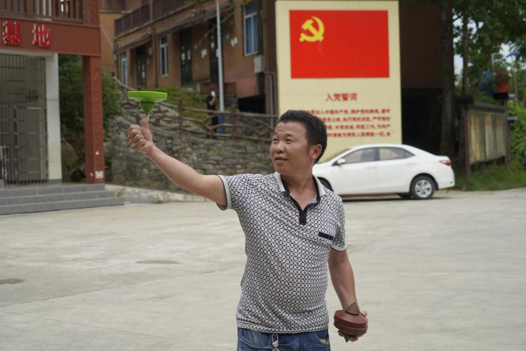 驻村书记梁斌在陀螺坊讲解白裤瑶陀螺文化