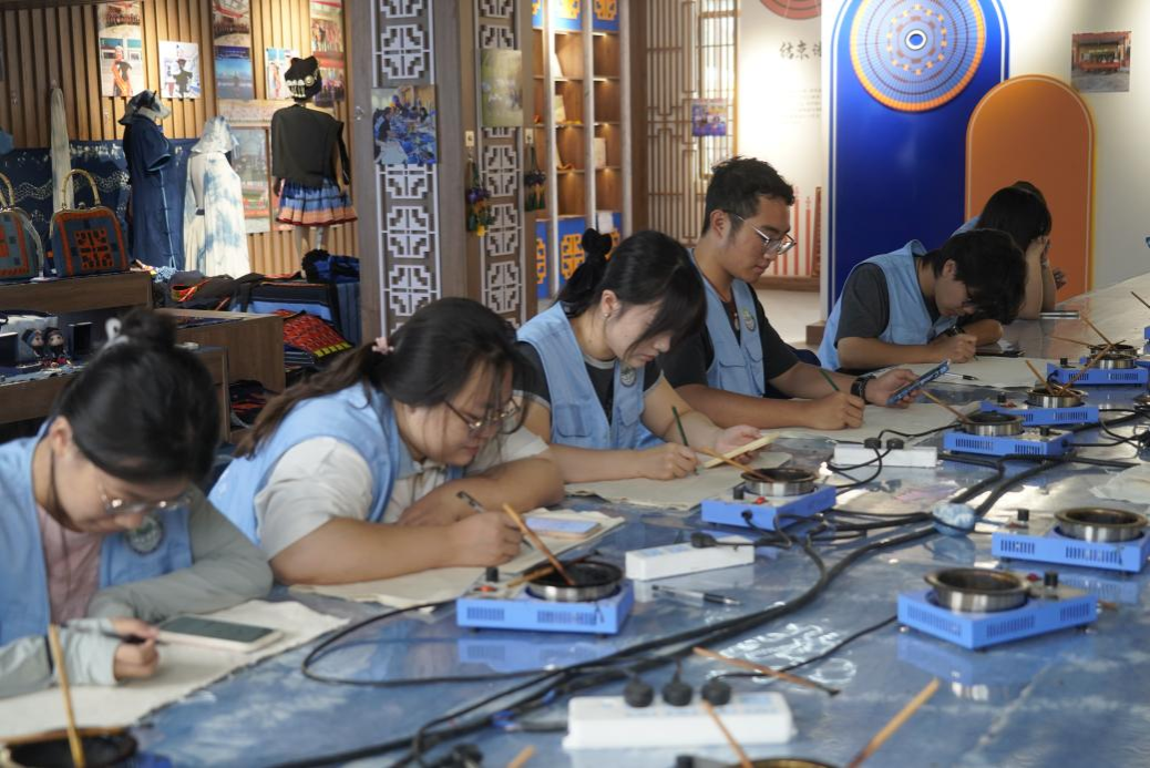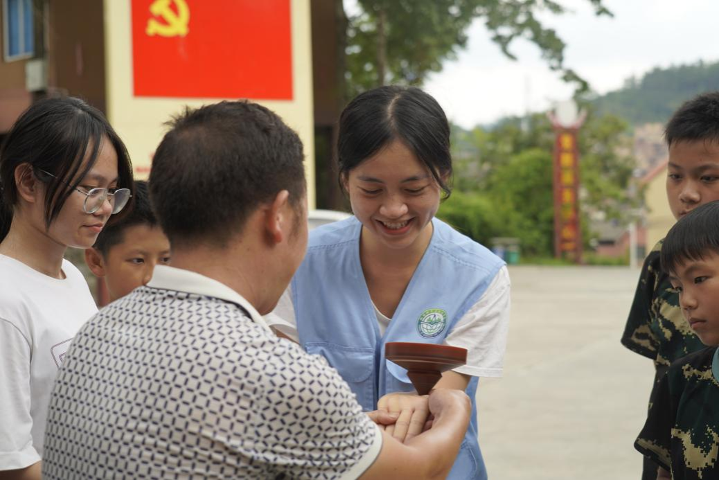 探访非遗文化,感悟民族瑰宝。实践团在瑶族服饰非遗传承人、社区党支部书记黎秋亿指引下,先后参观社区染坊、织绣坊及白裤瑶生态博物馆,亲手绘制粘膏画,深入了解白裤瑶族历史渊源与民俗风情。参观走访了铜鼓坊、陀螺坊,白裤瑶陀螺技艺传承人何光斌向实践团展示传统陀螺玩法。