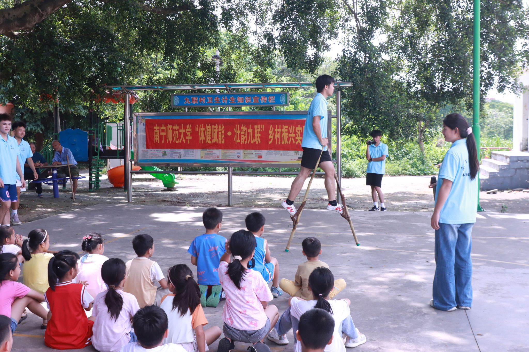 为弘扬民族传统文化,科普和推广少数民族传统体育项目,进一步丰富乡村小学生体育活动,7月16日,体育与健康学院“体健赋能·壮韵九联”暑期实践团在南宁市武鸣区九联村开展少数民族传统体育科普课堂。此次科普课堂由实践团队员吴青青主持,实践团队员依次展示各项目,九联村小学生参加。