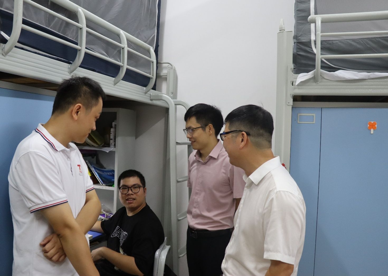 当日下午16点,学院继续开展新生宿舍慰问走访活动。由学院党委书记黎先、院长陆汝成、党委副书记莫雅兰、团委书记张慧荣、学院辅导员及各班班主任组成的慰问小组深入新生宿舍,为初入校园的同学们送去关怀与温暖。老师们围绕财产安全与防诈骗进行细致叮嘱,并亲切询问新生是否适应新环境、新室友,耐心解答学业规划、校园服务等方面的问题,同时鼓励同学们珍惜大学时光,做好学业规划,养成良好习惯,加强锻炼,互帮互助,共同营造积极向上的宿舍氛围。