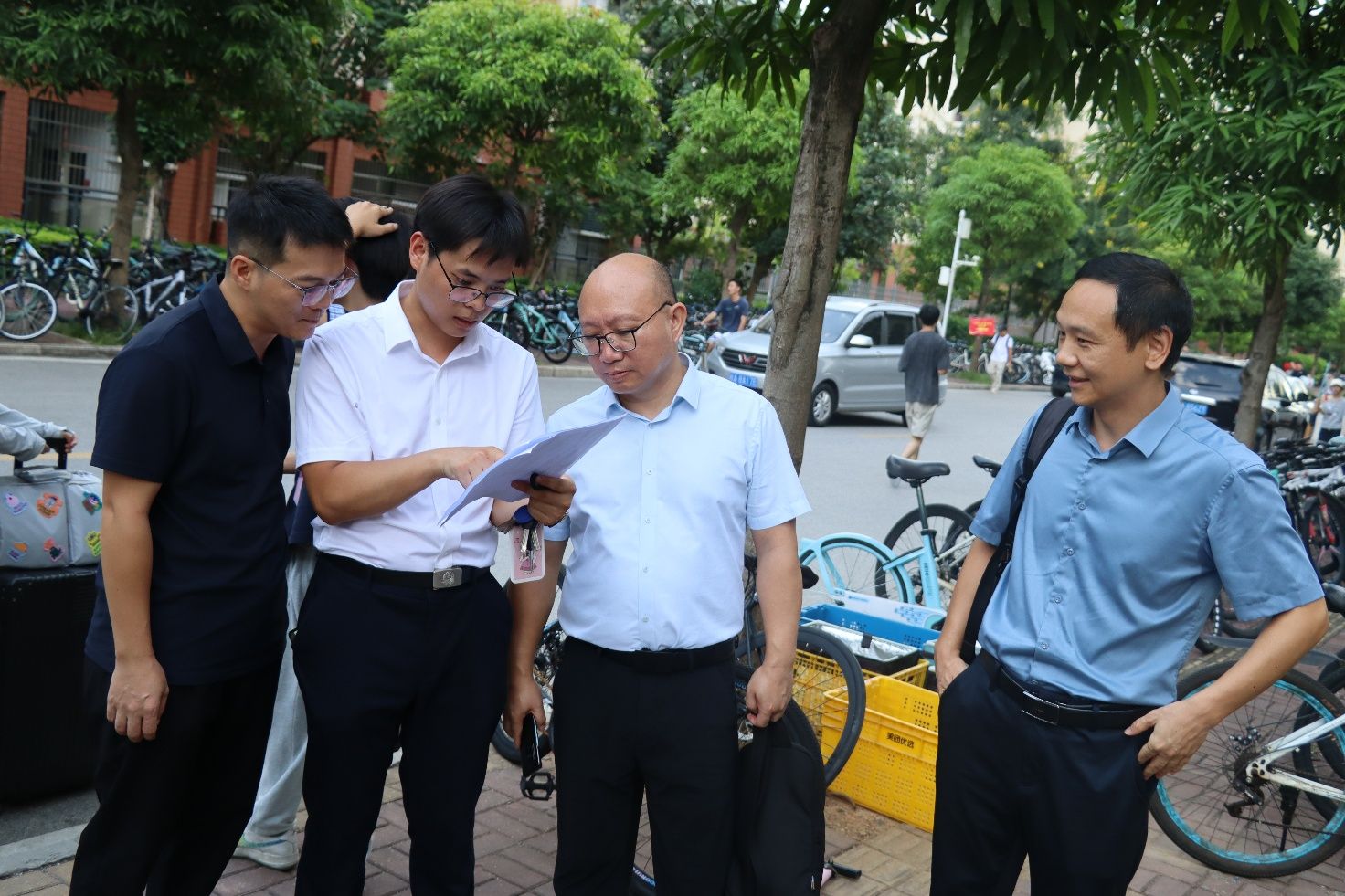 学院领导们来到迎新现场,一同慰问一线工作人员,并指导工作开展。迎新现场,团委、学生会的工作人员与新生助班分工明确、无缝衔接。工作人员们守候在各校门,主动帮新生搬运行李,耐心解答各类问题,确保新生顺利抵达报到点。助班们则高效办理入学手续,核对证件、发放物资、指导填写材料,为新生提供专业而温暖的一站式服务。大家通力协作,迎新工作秩序井然、温馨高效。期间,学校领导亲临学院报到区域检查指导,对学院周密的工作安排和师生饱满的热情给予充分肯定。校领导的关怀与鼓励为迎新工作注入了温暖与力量,让整个迎新现场氛围更加热烈、有序。