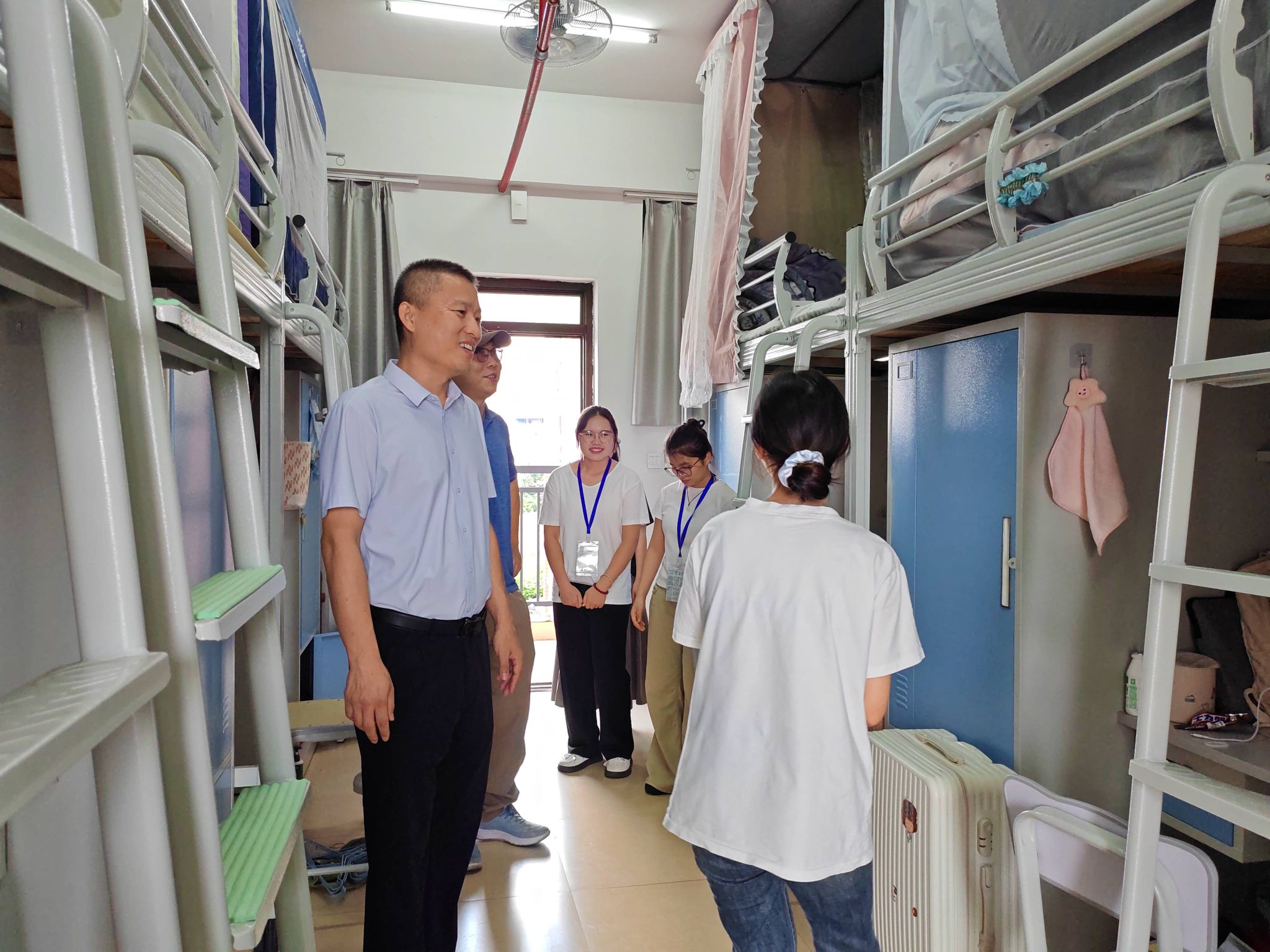 下午,学院党委书记陈兵、院长汪德荣、副书记黄宇、副院长刘新全、黎英、蔡宏果及院长助理李梅等全体领导,率辅导员、班主任及学生干部一行,深入走访了新生宿舍,亲切看望刚刚入校的同学们。走访期间,领导们细致察看了新生住宿环境,详细了解同学们的到校情况,并与大家亲切交流,细心询问每一位同学的家乡和初入大学的感受。他们叮嘱新生要增强安全意识,注重彼此包容与合作,努力营造和谐融洽的宿舍氛围。整个交流过程温馨而愉快,有效搭建起了师生之间暖心沟通的桥梁,为新学期的开启注入了温暖的底色。