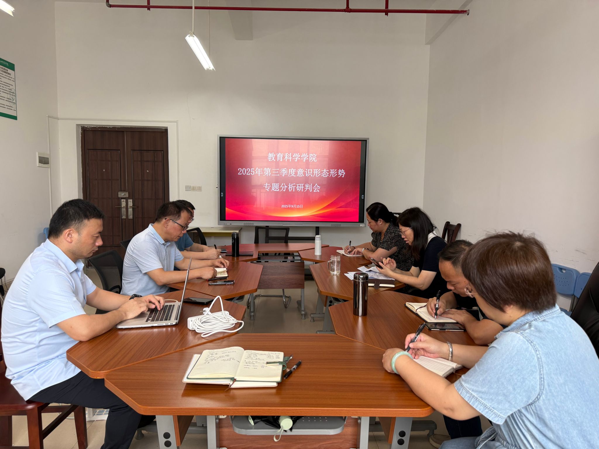 9月15日,教育科学学院于理综楼1004-2会议室召开学院第三季度意识形态形势专题分析研判会。学院班子成员、院长助理、学院纪委委员、学院党委组织员、团委书记等参加会议,本次会议由学院党委书记余朝文主持,会议对秋季新学期意识形态工作进行深入研讨与系统部署。