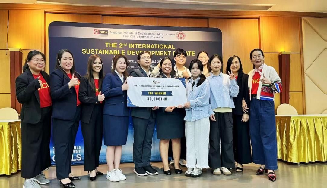 在为期一周的密集陪练中,中泰学子携手备战第二届国际可持续发展辩论比赛。双方队员就"解决世界饥饿更应该重视减少浪费而非增加食物产量"等辩题展开激烈交锋,在思维碰撞中相互学习、共同进步。决赛前夕,中泰队员花费一整天时间讨论修改辩稿到深夜,最终HCU辩论队战胜了新加坡国立大学、上海财经大学、华东师范大学的辩论队以及NIDA(泰国国立发展管理学院)的硕博团队,一举夺得冠军。"这个奖杯属于我们每一个人,"辩论队队长Harrit在赛后说到,"这是中泰友谊最好的见证。"