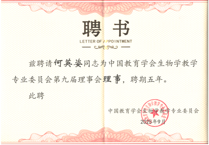 何英姿教授长期深耕教育领域,身兼数职且成果丰硕。她不仅是教育部高等学校大学生物学课程教学指导委员会委员,还担任广西高等学校生物科学与生物工程类教学指导委员会副主任委员、广西第二届自治区基础教育生物学教学指导专业委员会主任委员等重要职务。在教学实践中,何英姿教授始终坚守教育初心,积极推动教学改革创新,她所负责的《生物课程与教学论》入选国家级一流本科课程。