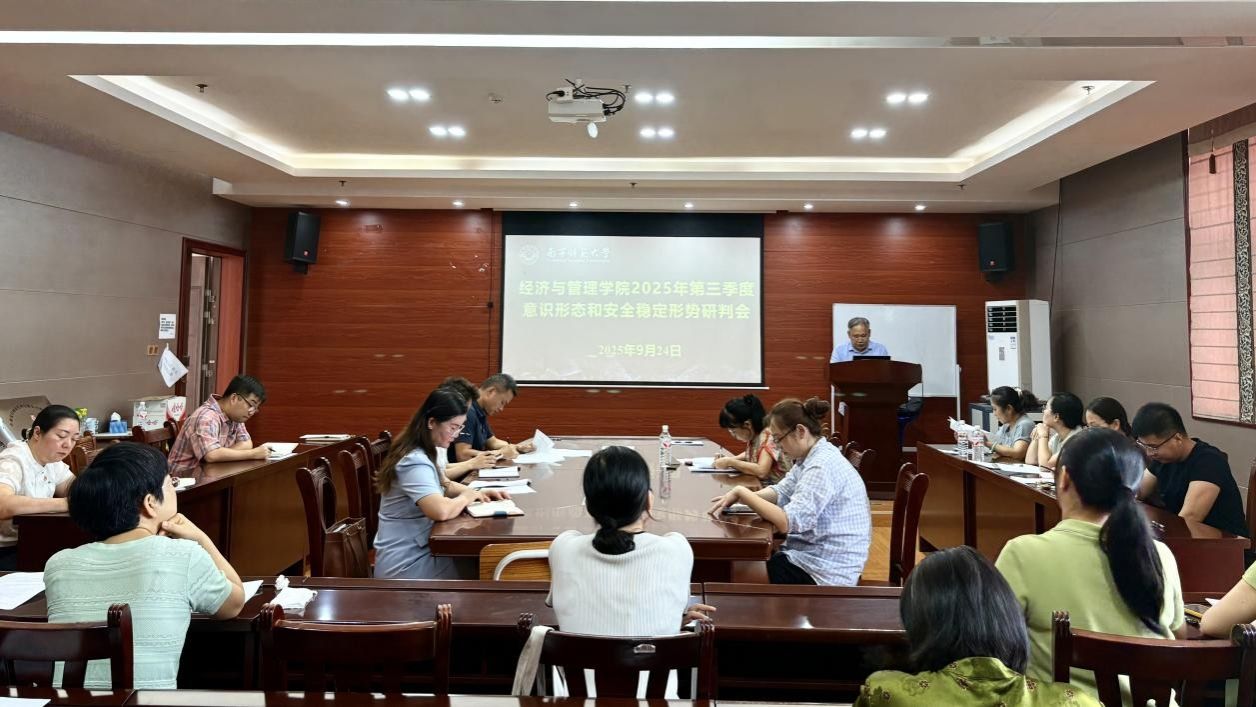 9月24日下午,经济与管理学院在理科综合楼召开2025年第三季度意识形态与安全稳定形势研判会。学院党委委员、学院全体教工党员参加会议。会议由学院党委书记韦海鸣主持。