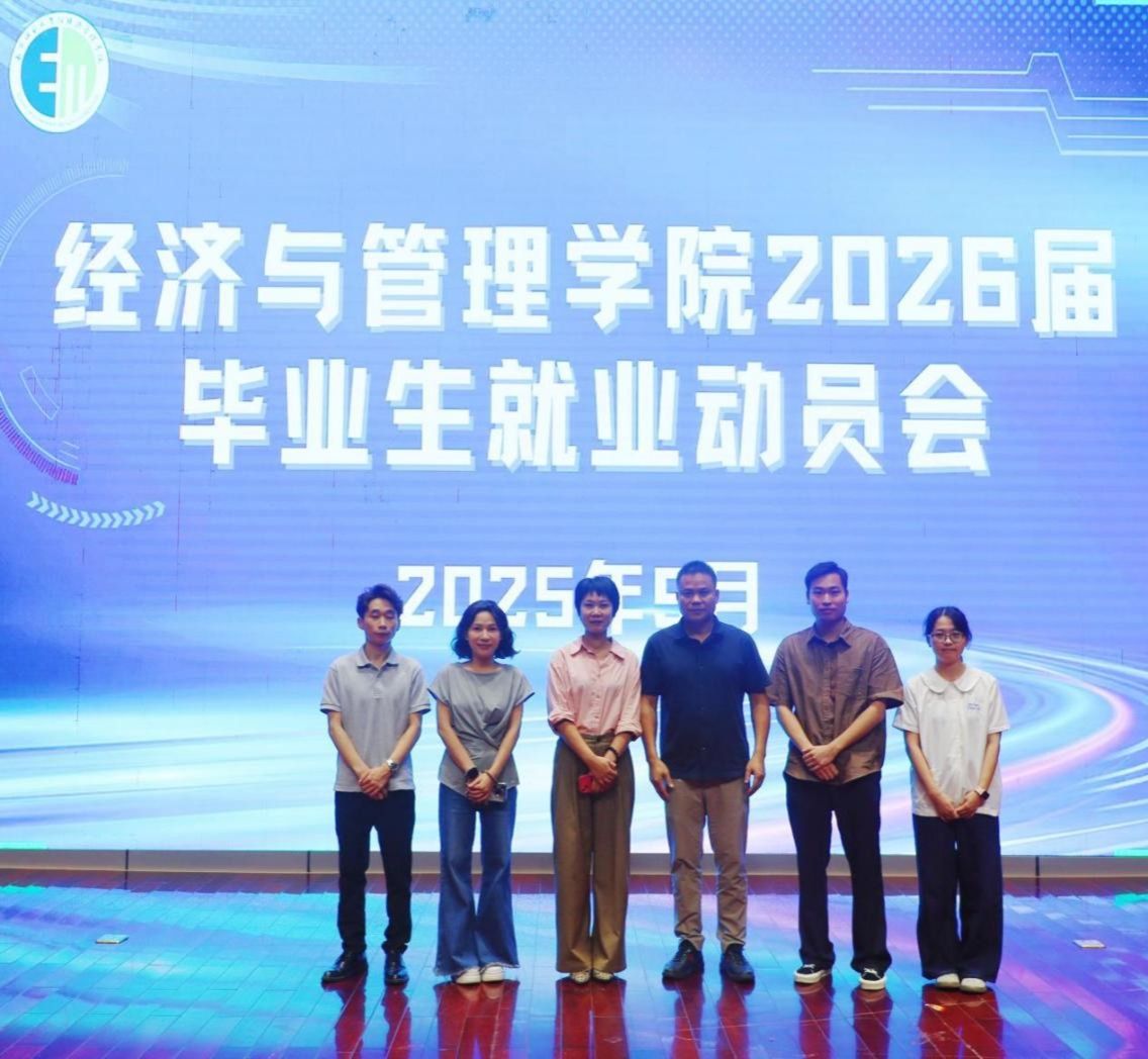 9月29日下午,经济与管理学院于文理综合楼文楼线上线下同步召开2026届毕业生就业动员会暨就业规划指导会。学院党委副书记谢统义、学工办辅导员兰勇、志公教育集团人力总监李月妹、优秀校友梁俊龙及优秀师姐陈巧兰担任主讲人,2026届全体毕业生参会。