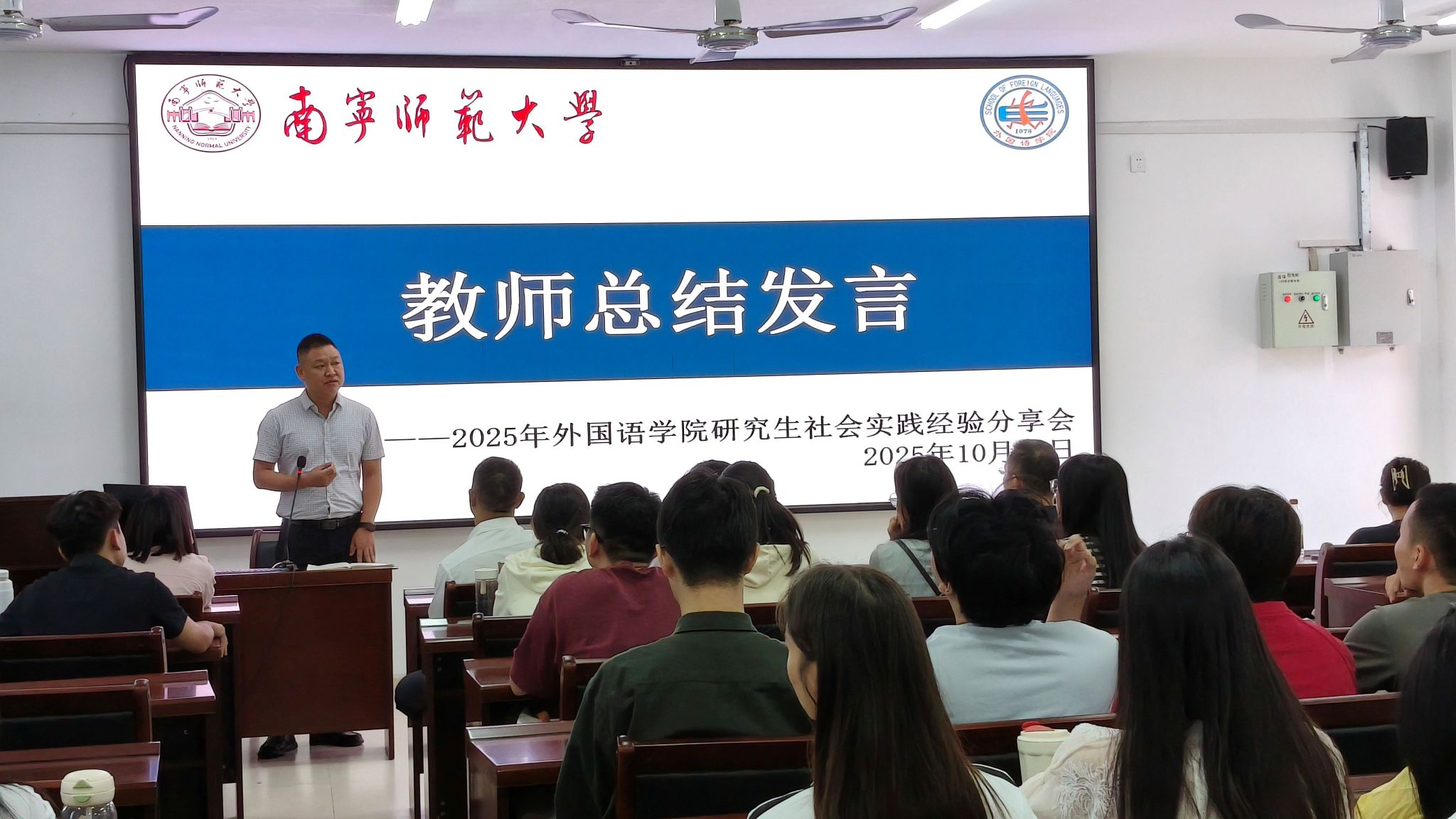 最后,蒙岚副院长、刘晖晖副书记、黄信教授、卢澄副教授作了总结发言。他们高度赞扬了参与此次分享的同学们的进步与成长,勉励2025级研究生以优秀前辈为榜样,勇于走出课堂舒适区,积极把握实践机遇,将外语专业能力与家国情怀、国际视野相融合,在社会实践中深化对现实社会的理解,不断锤炼综合素养,实现个人价值。