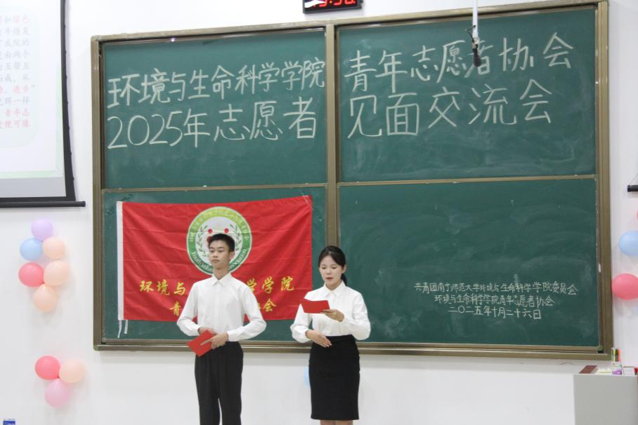 为帮助新志愿者尽快融入团队、深入理解志愿精神、提升协作能力,营造友爱互助的志愿氛围,10月26日晚,环境与生命科学学院青年志愿者协会在武鸣校区地海楼B109教室召开2025级志愿者团队见面交流会。青年志愿者协会成员及各年级志愿者共同参与了本次活动。