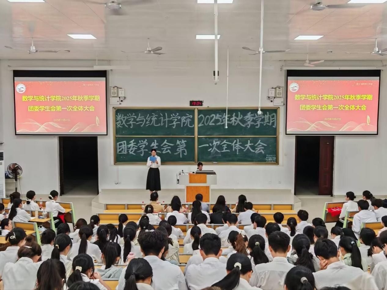 为帮助同学们清晰了解学院学生组织架构与工作方向,进一步加深对学院、学校的认同感与使命感,10月27日,数学与统计学院2025 年秋季学期团委学生会第一次全体大会在实验2-A105教室顺利召开。学院党委副书记王卫彬,团委书记梁卡霖,相关辅导员和老师,团委学生会常委及全体成员齐聚一堂,以青春之名赴约,为新学期团学工作注入新活力。