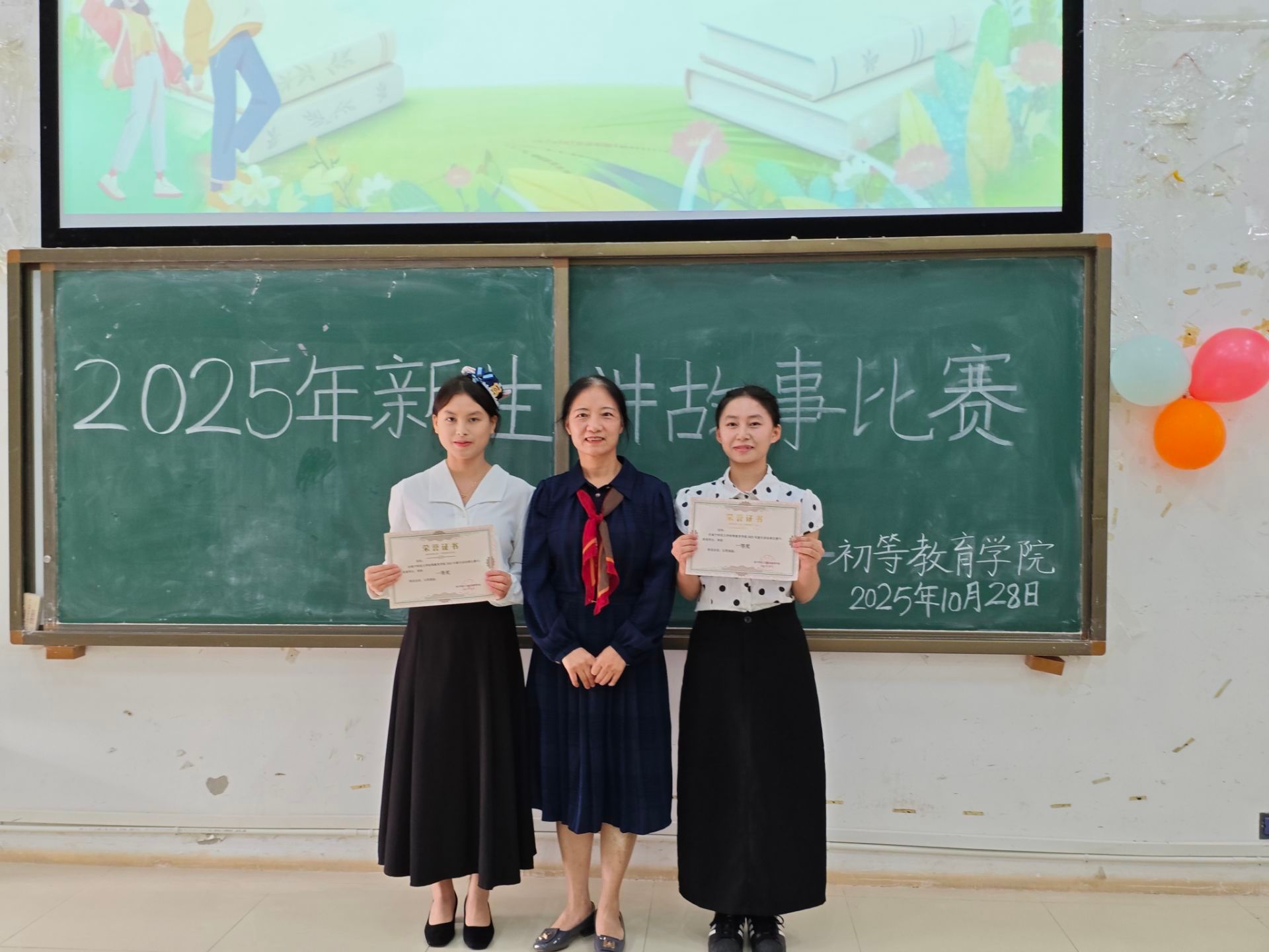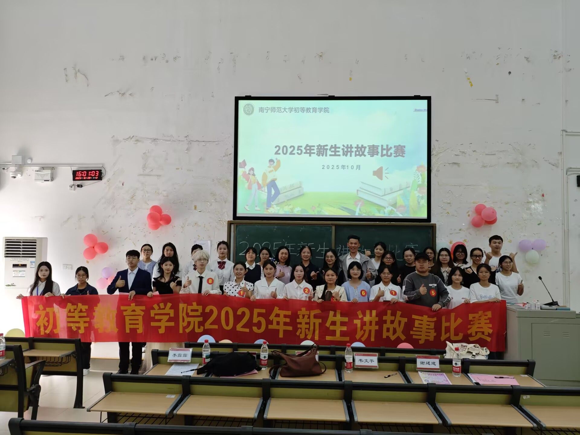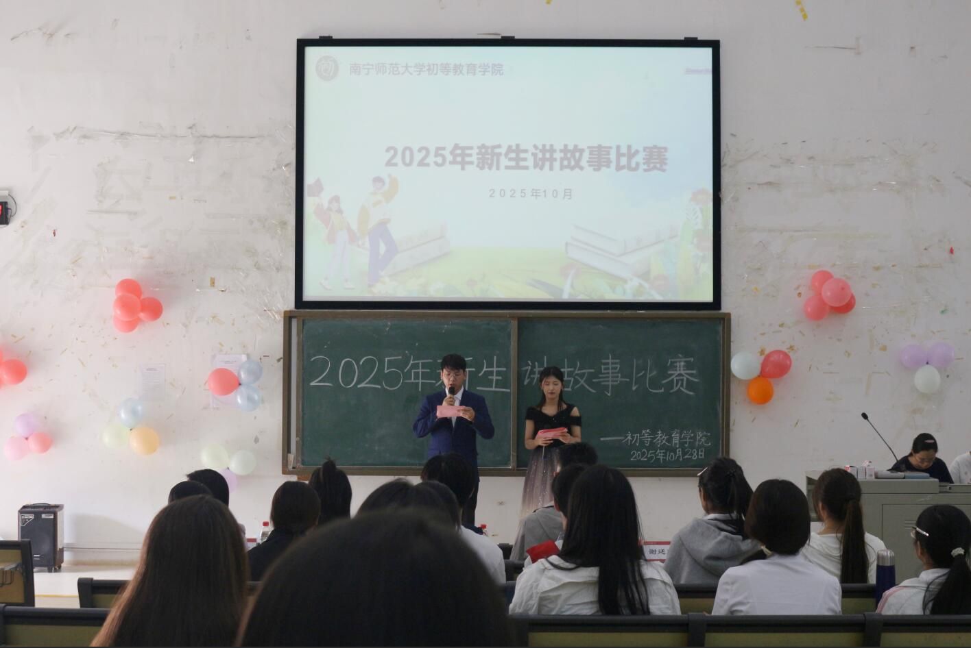 10月28日下午,初等教育学院在五合校区综合教学楼308教室举办2025年新生讲故事比赛。此次比赛评委由初等教育学院黄海燕老师、学工办辅导员李露露、秦晴和韦文平担任。五合校区兄弟学院代表、各社团代表及学院2025年新生共同参与。