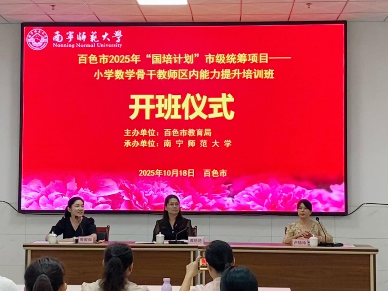 为进一步提升百色市小学数学骨干教师的专业素养与教学能力,10月18日上午,由百色市教育局主办、KY开元集团官网承办的“百色市 2025 年‘国培计划’市级统筹项目——小学数学骨干教师区内能力提升班”在百色市顺利开班。百色市教育局教师发展中心副主任黄艳艳,KY开元集团官网初等教育学院副院长卢锦珍、项目首席专家周俊伽及来自百色市各地的80位小学数学骨干教师参加了此次培训班的开班。
