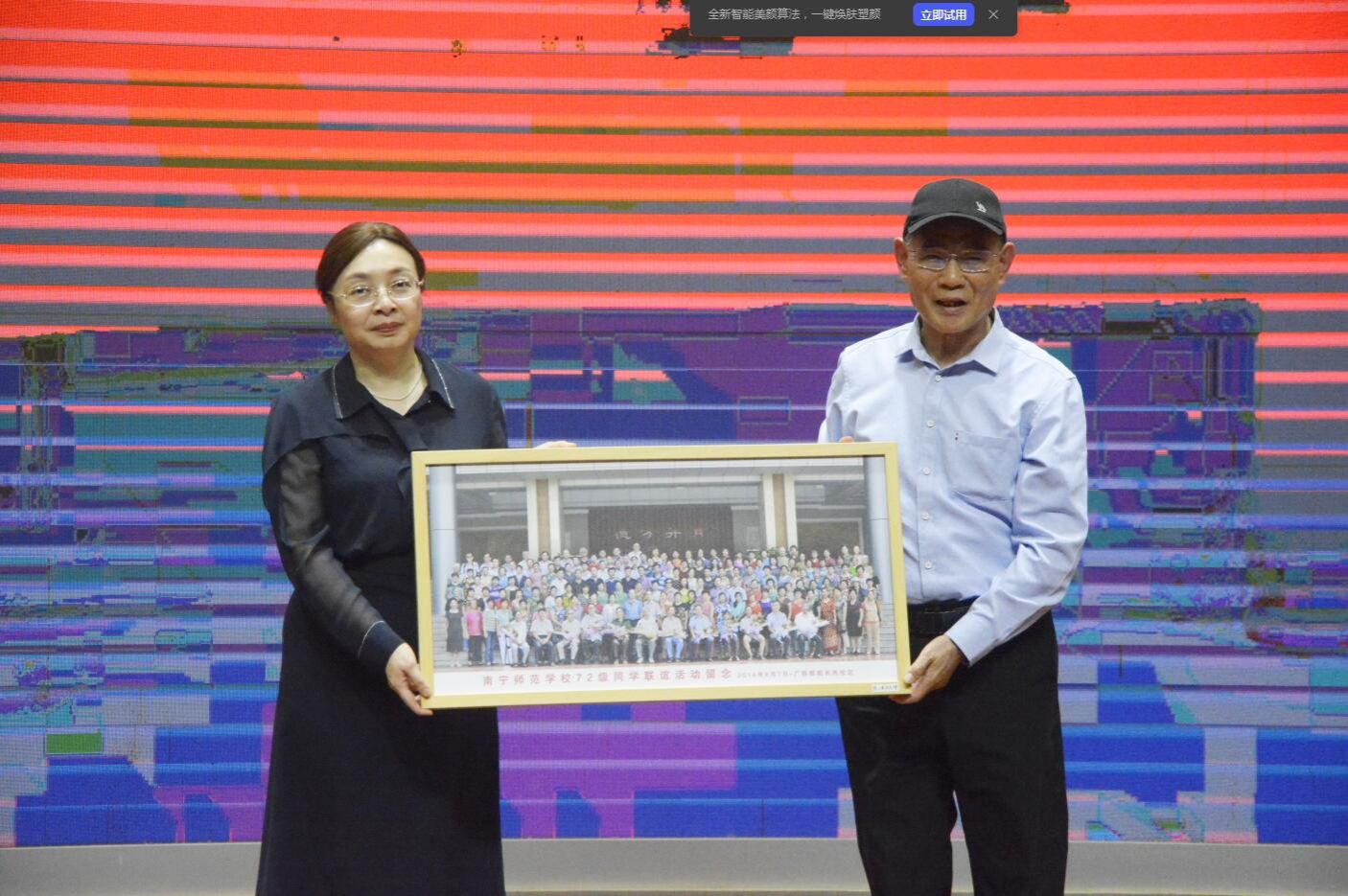 报告正式开场前,现场举行了捐赠仪式,陈小建校友向学院捐赠1972级全体学员毕业合影的珍贵影像,初等教育学院院长梁宇为其颁发纪念证书,氛围庄重而温馨。