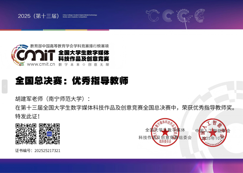 据悉,该赛事由中国人工智能学会与全国大学生数字媒体科技作品及创意竞赛组委会联合主办,哈尔滨工业大学等 45 所知名高校共同承办,是国内数字媒体领域极具权威性与影响力的全国性赛事。赛事历经校赛、省赛、全国复评等多轮严格评审,层层筛选出兼具创新性与实践性的优秀作品晋级全国总决赛。在总决赛现场,学院参赛团队与北京大学、清华大学、中国传媒大学、北京电影学院等高校团队同台竞技,通过作品现场展示、专业答辩等环节的激烈角逐,最终脱颖而出斩获一等奖,充分展现了学院学子过硬的创新实践能力与默契的团队协作精神。此次参赛过程中,学院得到了创新创业学院施夏珍老师的细心指导,给予专业建议,助力学子们在备赛路上少走弯路,以最佳状态迎接挑战。
