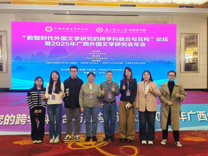 10月31日至11月2日,“数智时代外国文学研究的跨学科融合与互构”高峰论坛暨2025年广西外国文学研究会年会在历史文化名城桂林成功举行。本次会议旨在响应国家文化发展战略,推动新文科背景下外国文学研究的理论创新与话语体系构建。在外国语学院陈光伟院长的带领下,姚本标教授、江玉娥教授及六名硕士研究生应邀出席了此次学术盛会。