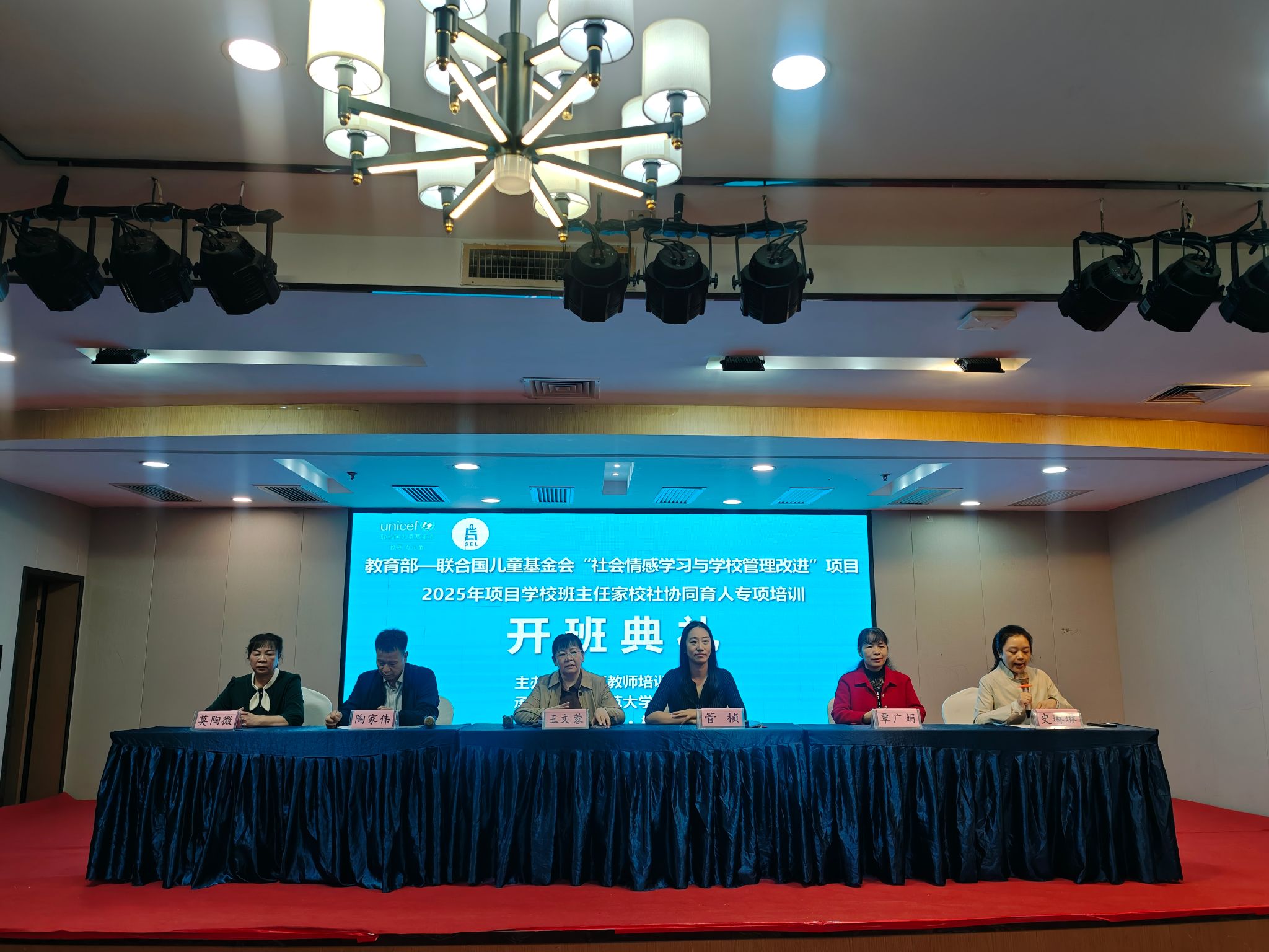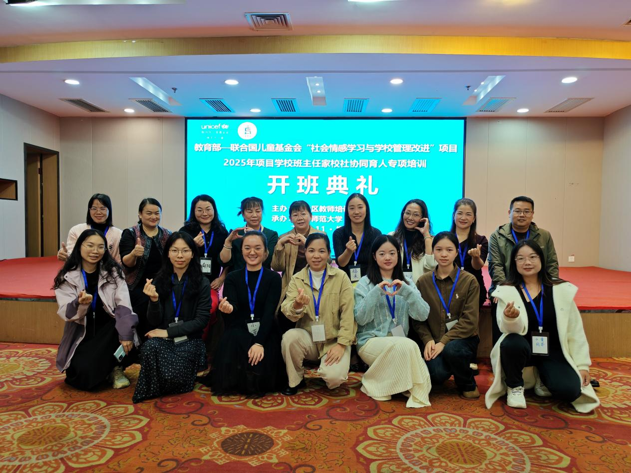 2025年11月6日上午,教育部—联合国儿童基金会“社会情感学习与学校管理改进”项目2025年项目学校班主任家校社协同育人专项培训在柳州正式启动。开元官网教师教育学院院长王文蓉,联合国儿童基金会顾问管帧、柳州市教师发展学校校长陶家伟等领导专家出席。来自玉林市容县、河池市环江县等地的项目负责人、县级专家及参训教师参加。开班仪式由自治区项目执行办史琳琳老师主持。