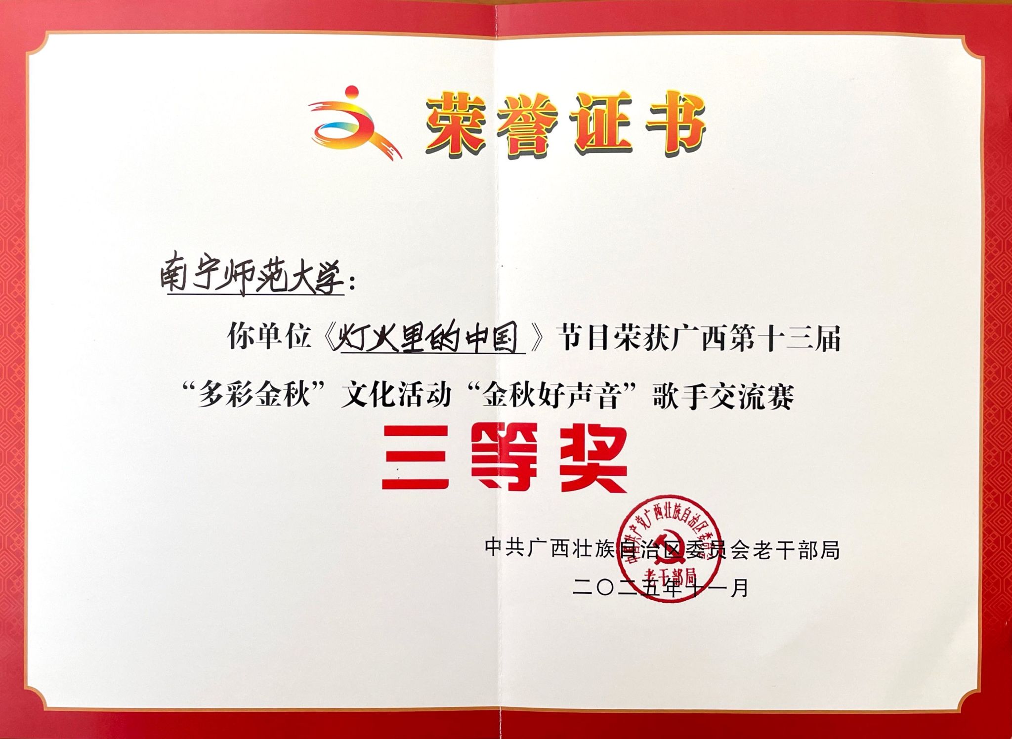 11月7日,开元官网离退休教职工代表队参加由自治区党委老干部局主办的广西第十三届“多彩金秋”文化活动“金秋好声音”歌手交流赛,以一曲《灯火里的中国》登台献艺,在比赛中绽放别样光彩,荣获三等奖。