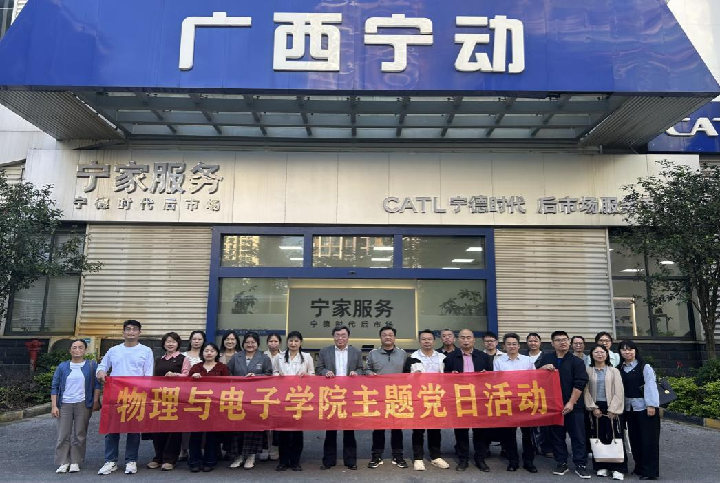 为深化校企党建协同共建,拓宽人才培养与就业合作渠道,切实将党建优势转化为育人实效与发展动能。11 月 13 日,物理与电子学院第一教工党支部书记徐艳华教授组织教工第一、二党支部党员分别赴广西宁动新能源科技有限公司和桂林理工大学南宁产业研究院开展“校企协同・双向赋能”主题党日活动,搭建校企互动的交流桥梁。