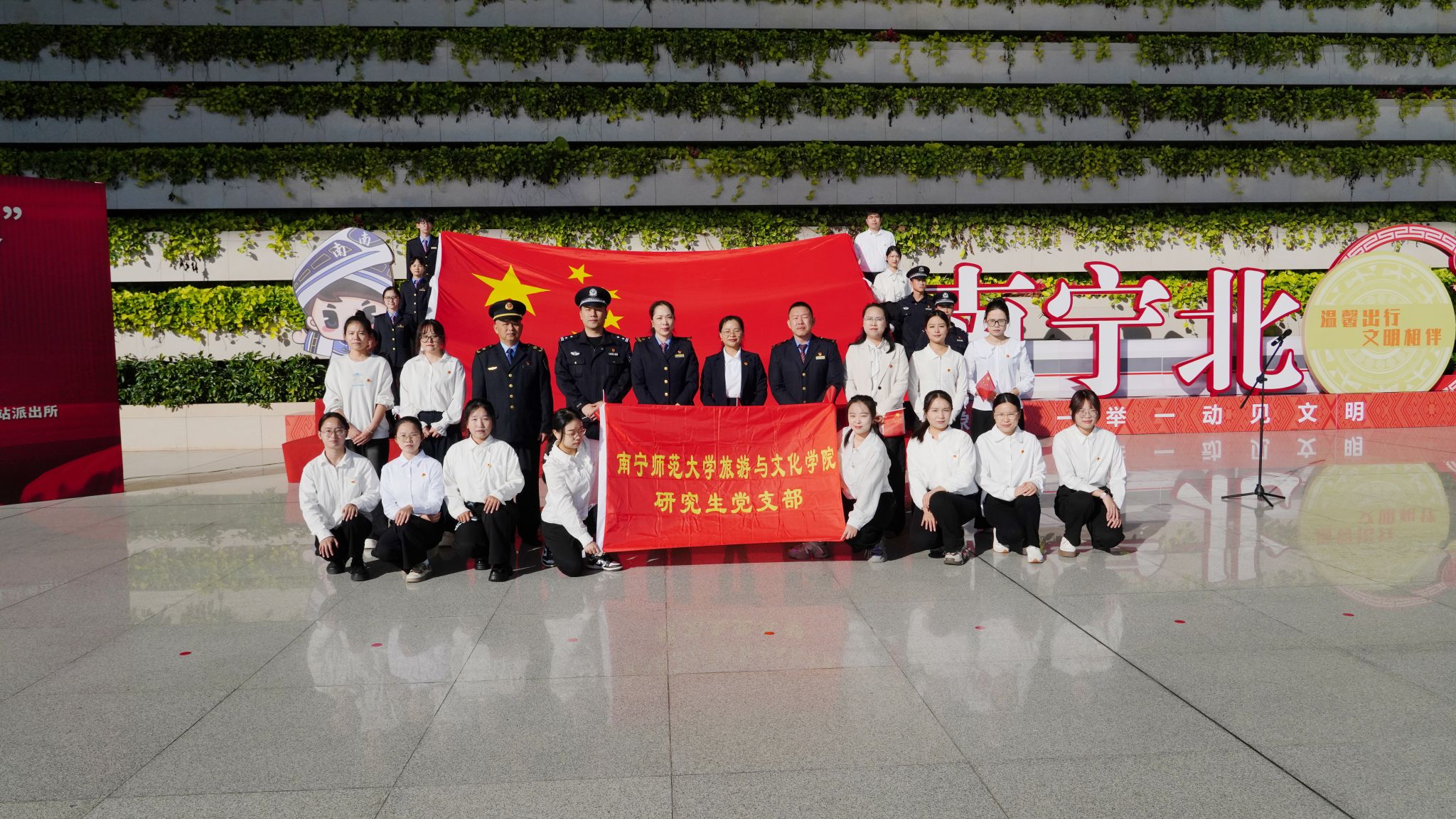 为深入学习贯彻党的二十届四中全会精神,厚植研究生党员爱国主义情怀,强化党建联盟单位协同育人实效,11月14日上午,旅游与文化学院党委副书记黄珍、研究生党支部书记陈春容带领支部成员,赴南宁北站落客平台,与南宁车站、南宁北站派出所等党建联盟单位共同参与“国旗在我心中——向胜利出发”天安门广场国旗巡展第11站(南宁北站)爱国主义教育活动,在庄重仪式与深度互动中传承红色基因,凝聚旅文学子奋进力量。
