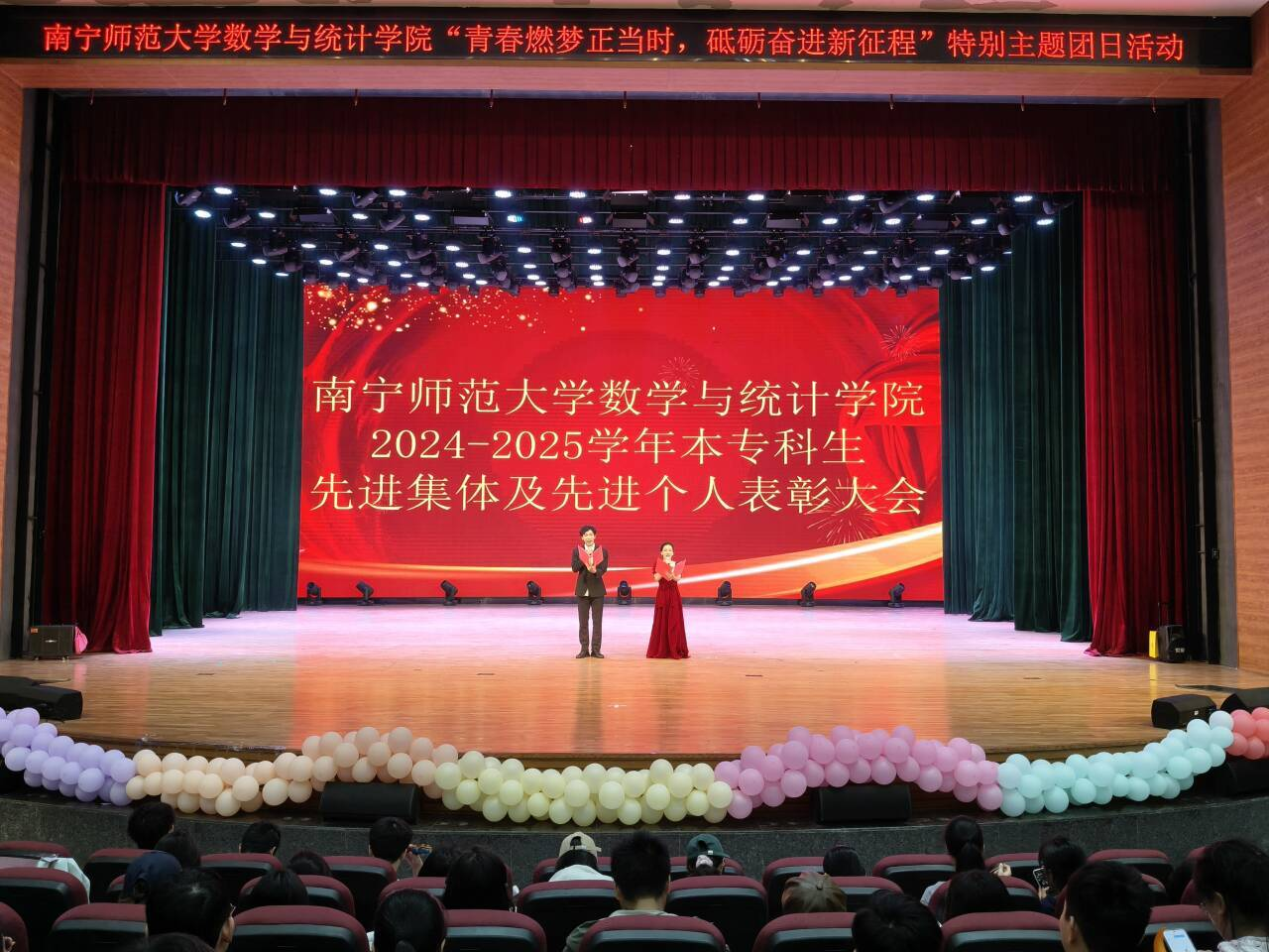 为表彰先进典型、凝聚奋进力量,营造“比学赶超、奋勇争先”的优良学风,11月16日晚,数学与统计学院于音舞楼千人演播厅顺利举办2024-2025学年本专科生先进集体及个人表彰大会。学院领导班子、辅导员老师们、优秀学生代表及2025级全体同学齐聚现场,共同见证荣光时刻。