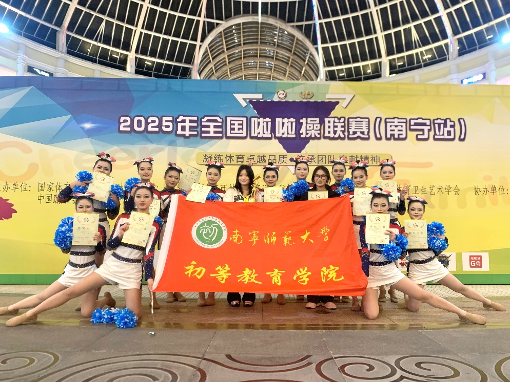 11月21日晚,2025年全国啦啦操联赛(南宁站)圆满落幕,初等教育学院学生啦啦操团队“花样梦之队”奋勇拼搏、表现亮眼,在公开青年乙组—集体花球自选动作项目中脱颖而出,斩获第一名。