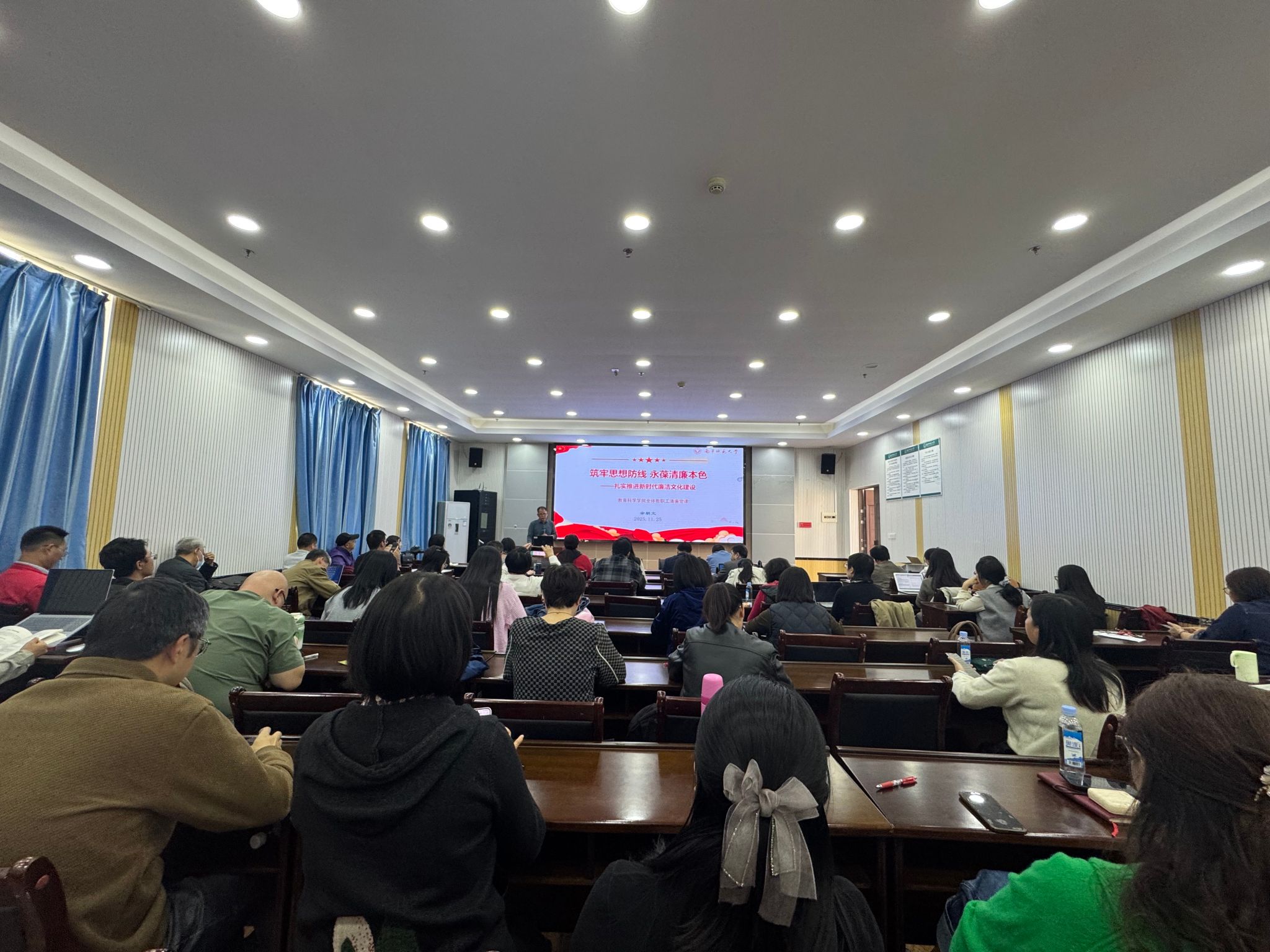 最后,余书记向全院教师发出倡议:要牢记教师身份,强化师德师风,规范经费使用与学术行为,严守意识形态关口,同时以良好家风涵养廉洁作风。参会教师纷纷表示,此次党课既有理论高度又有实践温度,将把廉洁要求融入教学、科研、育人全过程,以实际行动践行使命担当。下一步,教育科学学院将以此次党课为契机,持续推进清廉教育常态化,推动廉洁文化与学院工作深度融合,打造风清气正的育人环境。