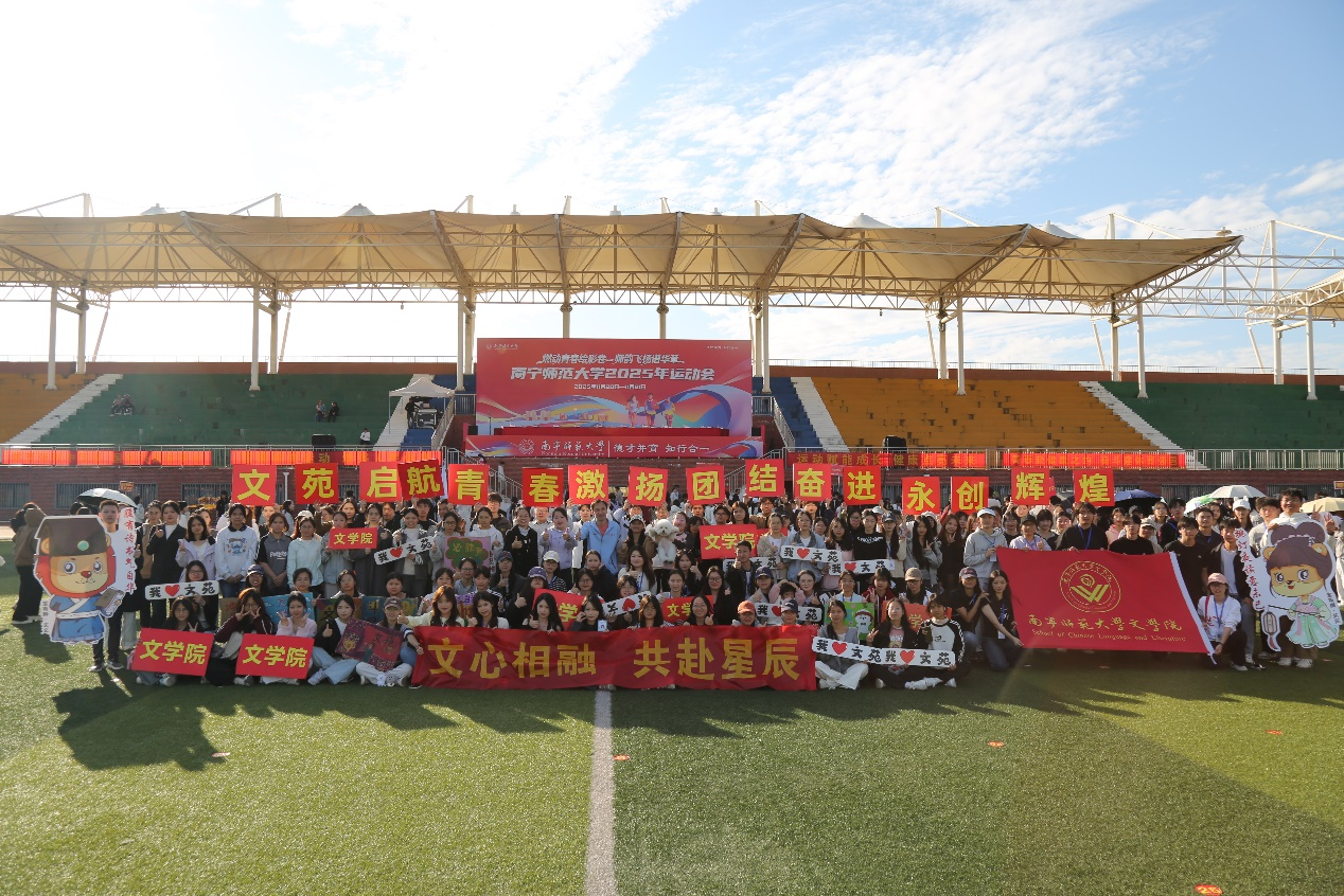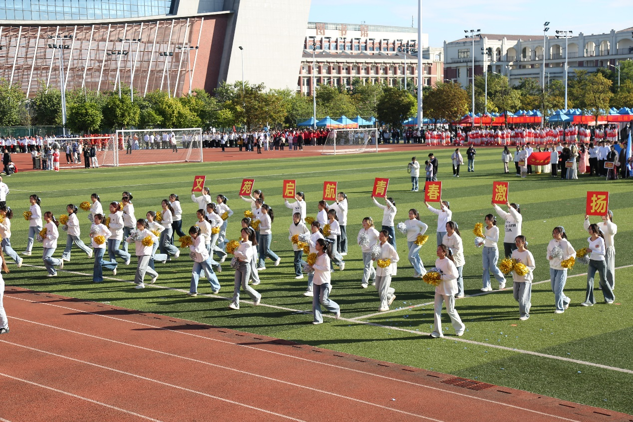 开幕式上,伴随着《运动员进行曲》,文学院师生代表身着统一的服装,手持“我爱文苑”加油牌入场,抬着红色院旗和文苑形象斗志昂扬地走过主席台。在驻场表演中,文学院方块队带来精心编排、活力四射的团体操表演,动作整齐划一,舞姿活泼轻快,嘹亮的口号展现蓬勃朝气与团结精神。
