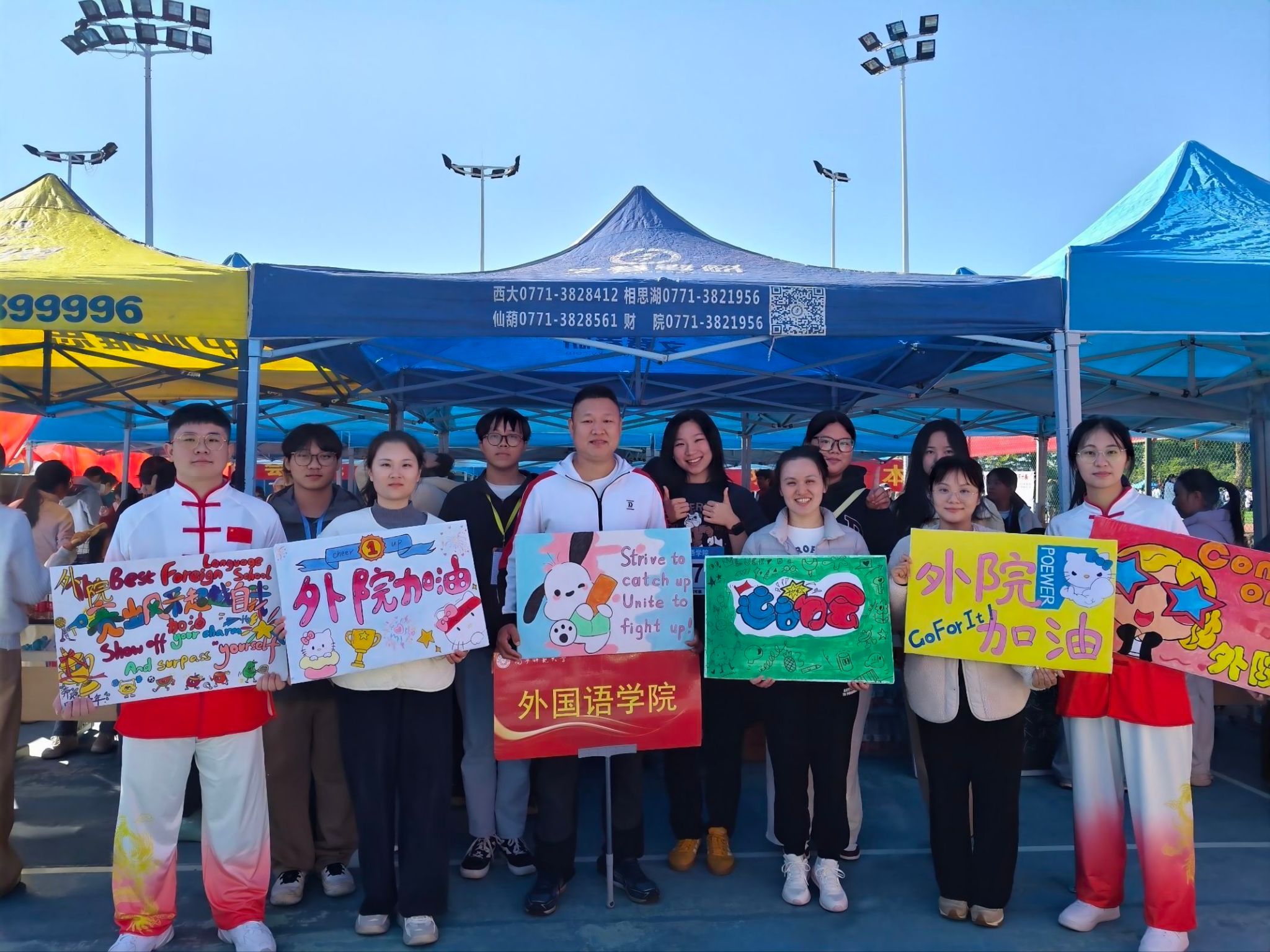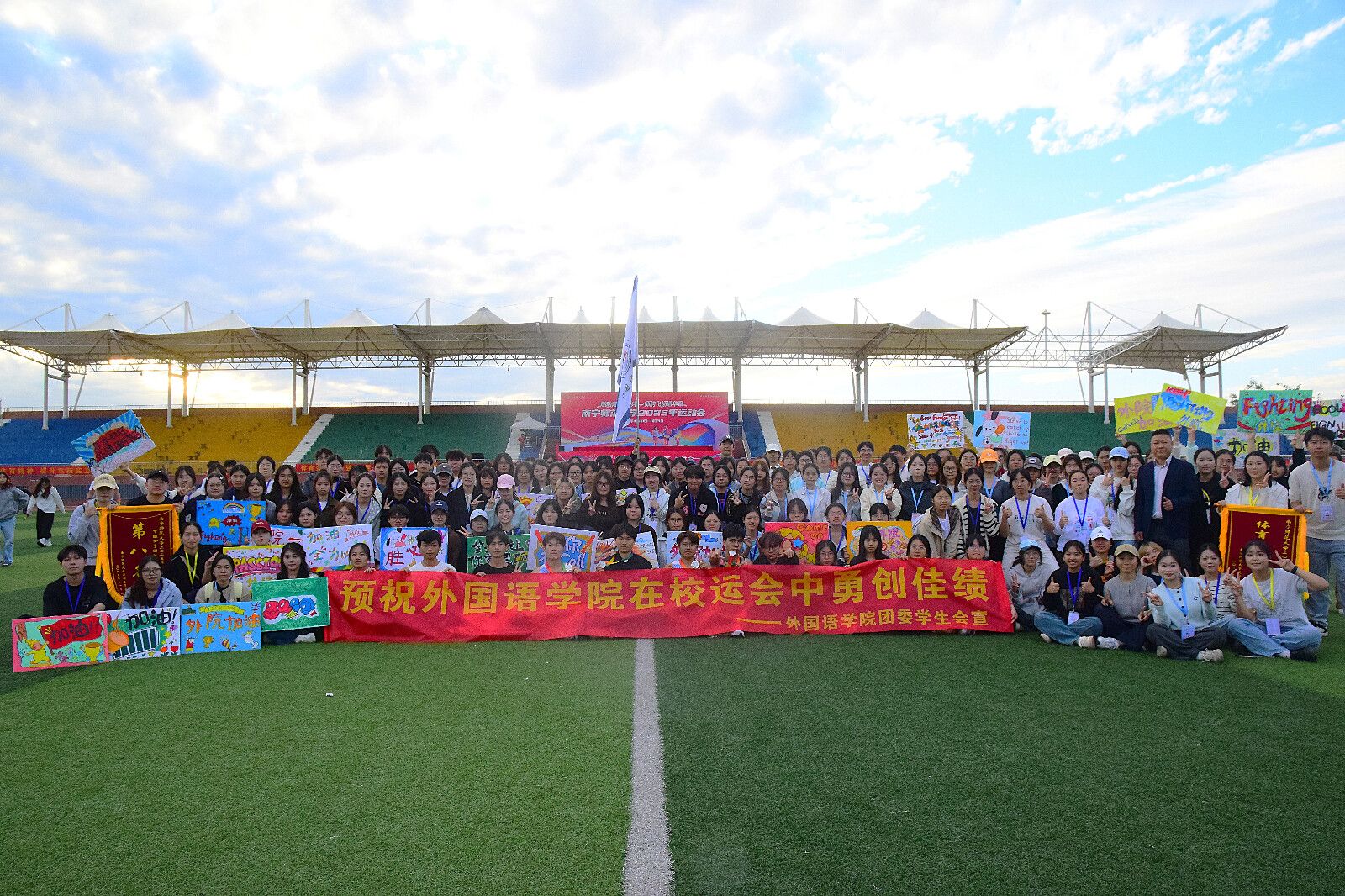 校运会期间,外国语学院师生积极参与、全情投入。开幕式上,方块队阵容整齐,精彩亮相,展现出外院学子昂扬的风貌。啦啦队成员则高举加油牌,用最响亮的声音为赛场上的运动员们助威呐喊。团委学生会各部门工作人员人员坚守岗位,为赛事顺利进行提供了坚实的组织与后勤保障。此外,我院教职工也积极参与趣味运动会,在轻松愉快的氛围中展现出良好的团队协作精神和竞赛风貌。