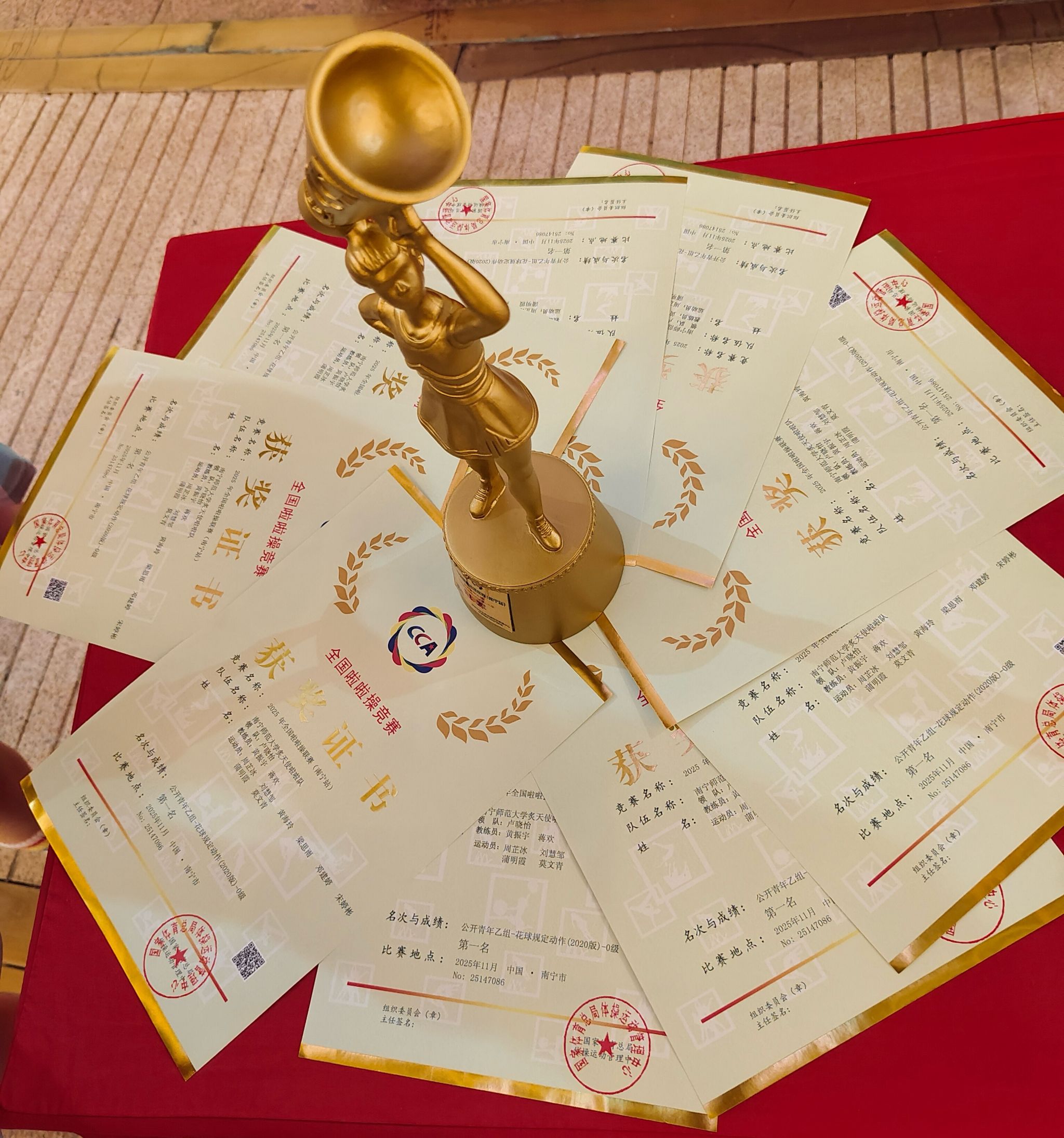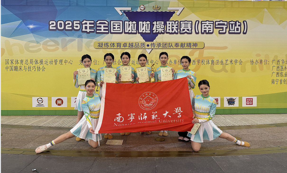 在2025年全国啦啦操联赛(南宁站)中,教育科学学院光之翼艺术团啦啦队以高标准、严要求训练队伍,坚持精益求精,运用丰富且具有感染力的表演,配合整齐规范的动作最终荣获公开青年乙组-花球规定动作(2020版)-0级第一名。