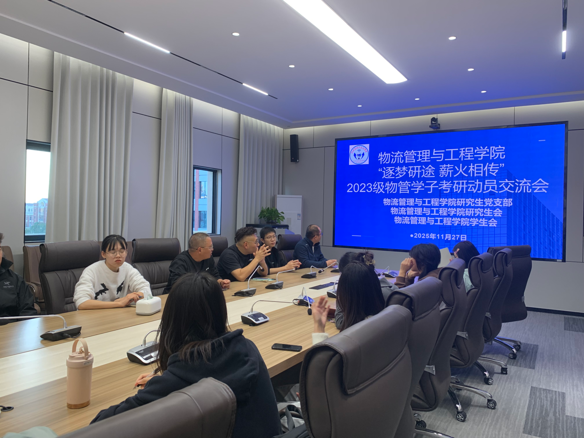 为帮助有考研意向的同学精准把握备考方向、科学规划复习路径,同时获得专业实用的院校选择指导,11月27日下午,物流管理与工程学院研究生党支部、学院研究生会、学院学生会于地化楼C-414联合举办了以“逐梦研途·薪火相传”为主题的考研动员交流会。学院党委副书记黄宇、研究生秘书崔轶平、辅导员刘明炯,以及部分2025级研究生代表与2023级有意向考研的学生共同参加了本次会议。
