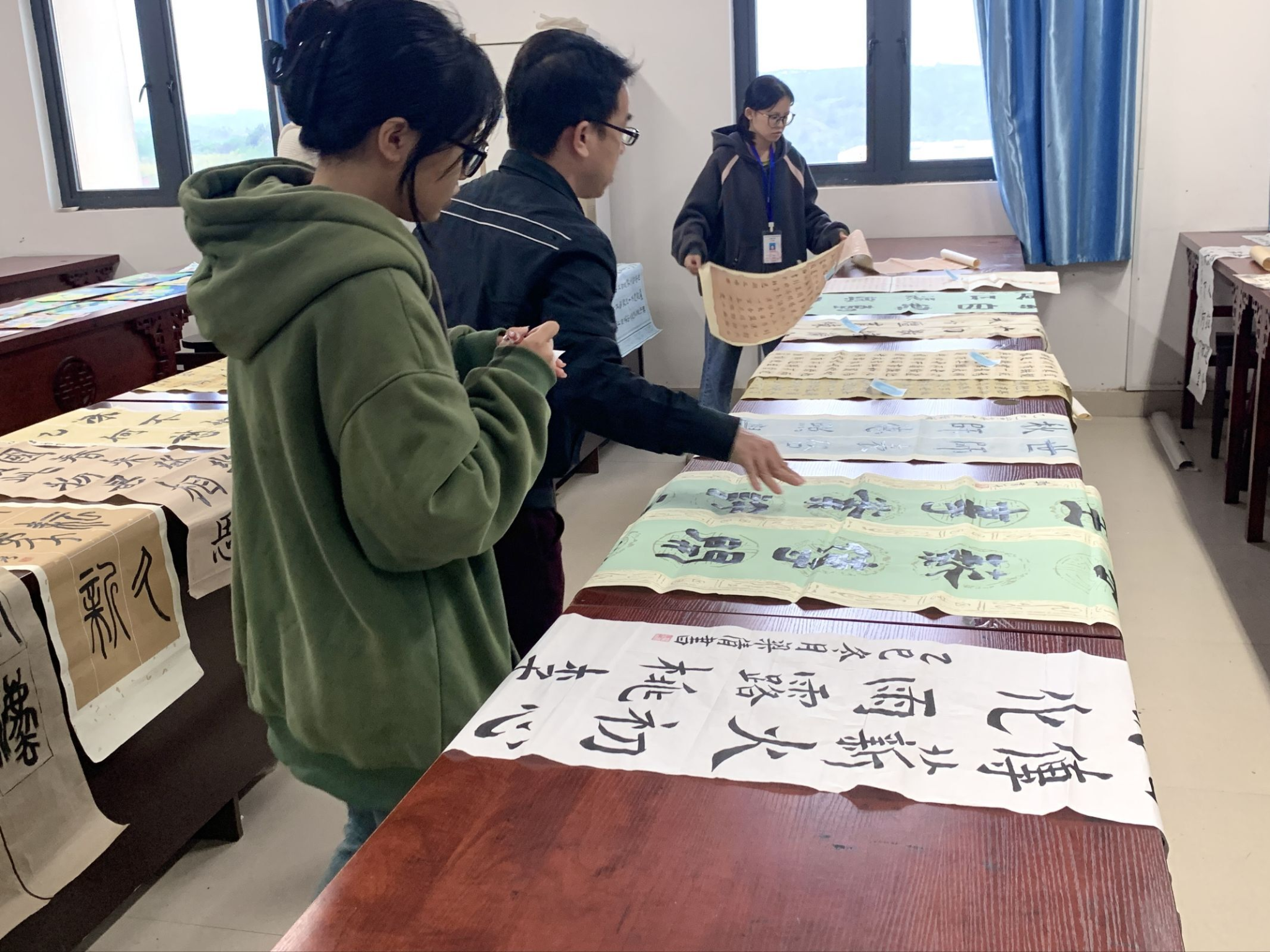 本次活动前期面向学院全体学子征集原创书画作品。在展评现场,工作人员们各司其职,有序开展作品展示、现场拍摄及引导教师评选等;线上则通过三韵书社官方QQ账号进行宣传,并收集整理“五日书画打卡”活动素材。墨香氤氲中洋溢着真挚的祝福,笔墨流转间传递着深厚的情谊。