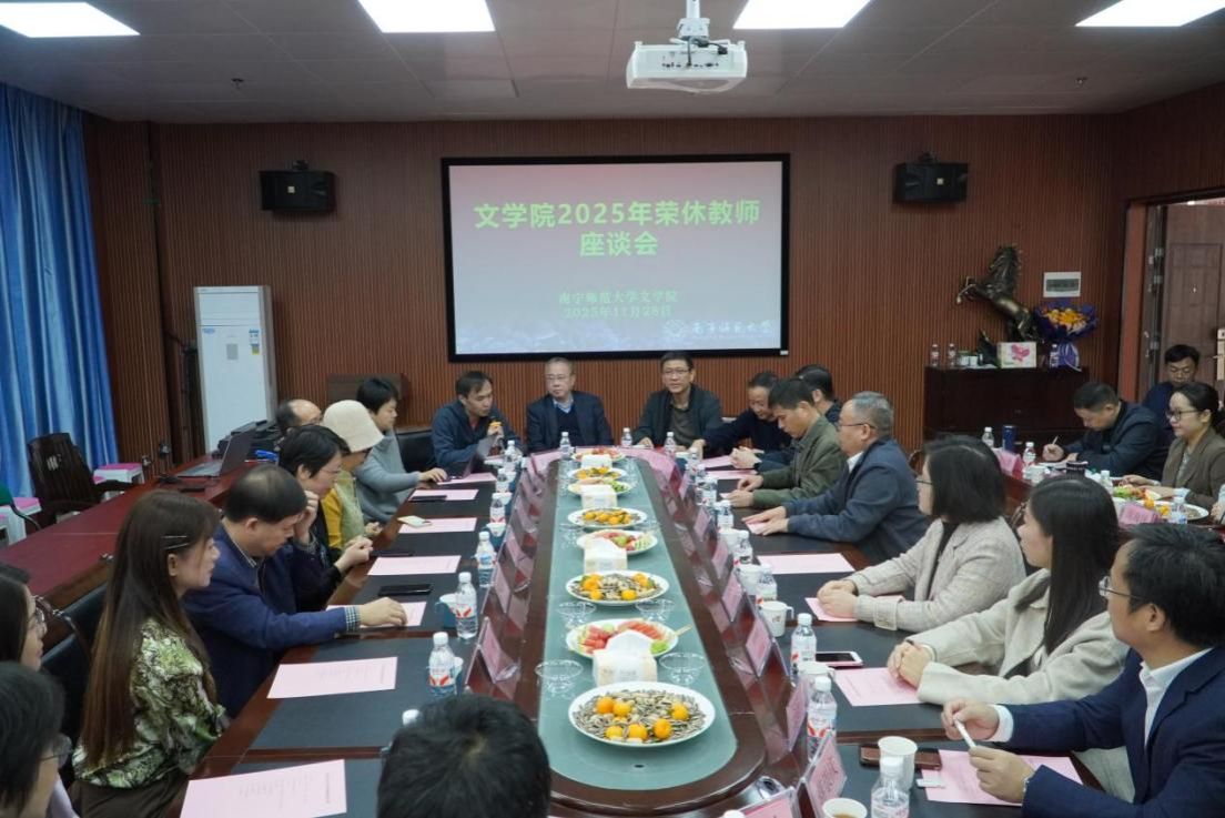11月28日上午,在理科综合楼404文学院会议室举行宾恩海教授荣休座谈会,文学院党委书记石勇博士,副院长刘振平教授(主持行政工作),院长助理石艺教授、现当代文学教研室教师代表及文学院在读各班本科学生代表与研究生代表以及来自南宁二中、三中、广西大学附中、南宁八中、南宁三十六中、柳州地区民族高中、广西中医学校、广西壮族自治区教育厅、广西广播电视台、玉林师范学院、广西工商职业技术学院、桂林广文文旅公司、广西城乡国际咨询公司任职的学生代表近一百人参加座谈会。座谈会由文学院党委副书记吴幼坚主持。