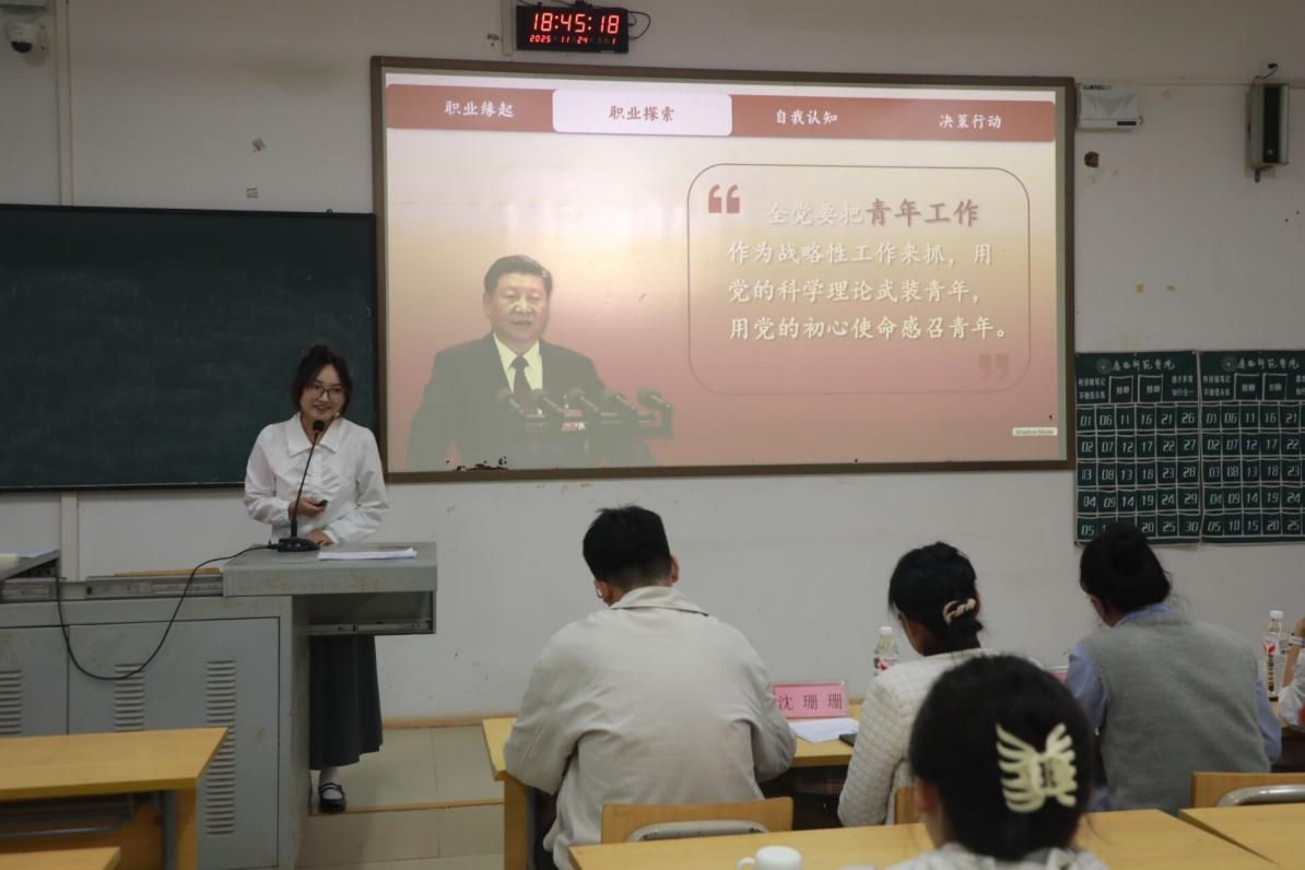 为让同学们树立正确的就业观念,对未来有清晰的规划,文学院于11月24日晚上在五综109、110教室举办第十一届大学生职业生涯规划大赛。本次比赛由文学院辅导员,学校学生就业中心兼辅杨于洁,文学院2023级兼辅张文龙,2025级兼职辅导员崖佳玲、黄维亮,常委周佳欣、黄晓玲出席并担任评委。