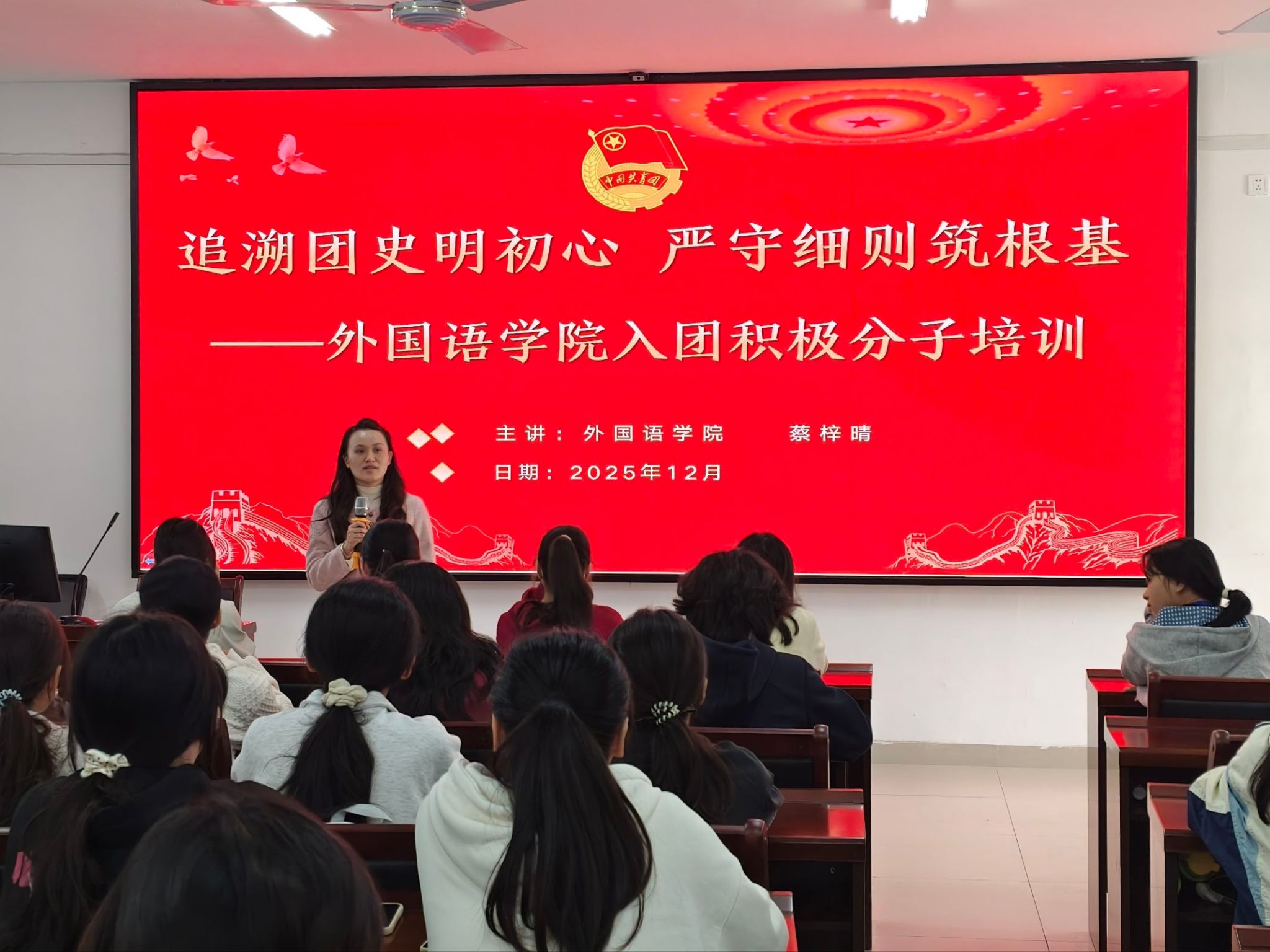为规范团员发展流程,提高入团积极分子培养质量,12月9日下午,外国语学院在实验楼1B-515报告厅召开以“追溯团史明初心,严守细则筑根基”为主题的入团积极分子培训会。本次培训会由学院学工办蔡梓晴老师主讲,团委组织部成员和全体入团积极分子参加。